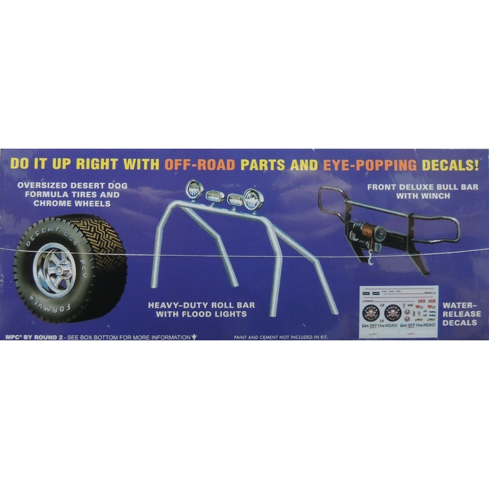 Back by popular demand! MPC’s off-road 1984 GMC pickup is a modeler favorite. This special reissue is available molded in black for experienced modelers wanting to paint it any color they choose. It also features irresistible new packaging illustrations from Don Greer. With its off-road accessories, raised suspension, oversized tires, and colorful new decal options.