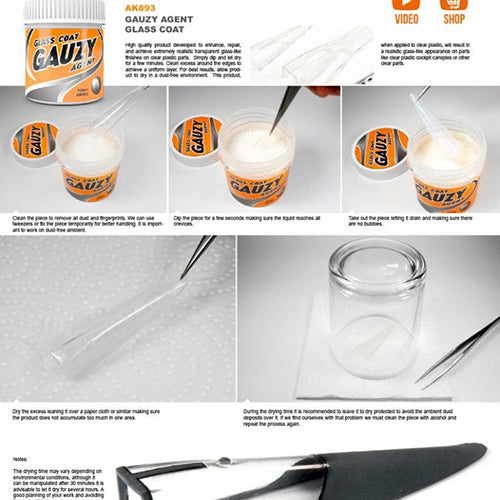 High quality product developed to enhance, repair, and achieve extremely realistic transparent glass-like finishes on clear plastic parts. Simply dip and let dry for a few minutes. The bottle is thick to dip parts without problem. Clean excess around the edges to achieve a uniform layer. For best results, allow product to dry in a dust-free environment. This product, when applied to clear plastic, will result in a realistic glass-like appearance on parts like clear plastic cockpit canopies or other clear parts.