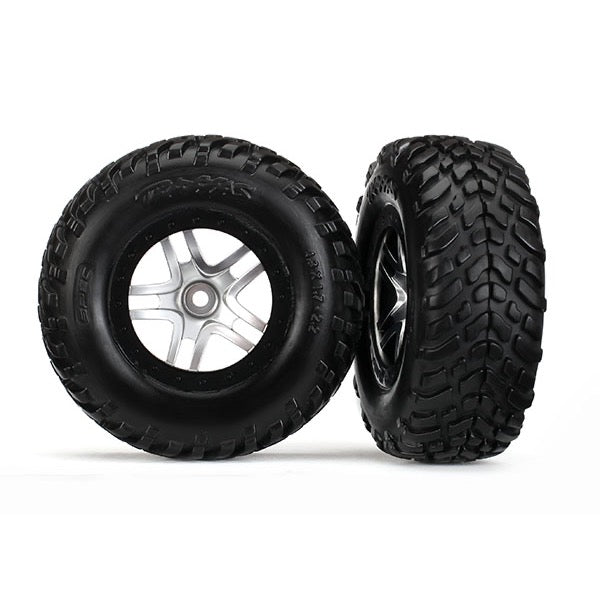 Pair of SCT off-road tires come pre-glued and mounted with foam inserts to satin chrome Split-Spoke wheels with black beadlock-style trim. TSM®-rated for high-speed applications. Fits 12 mm hex, 4WD front or rear, 2WD rear only.