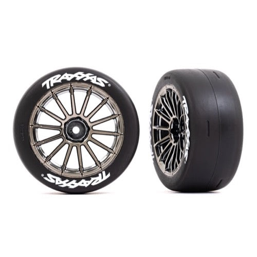 Tires & wheels, assembled, glued (multi-spoke black chrome wheels, 2.0" slick tires with Traxxas® logo, foam inserts) (rear) (2) (VXL rated)