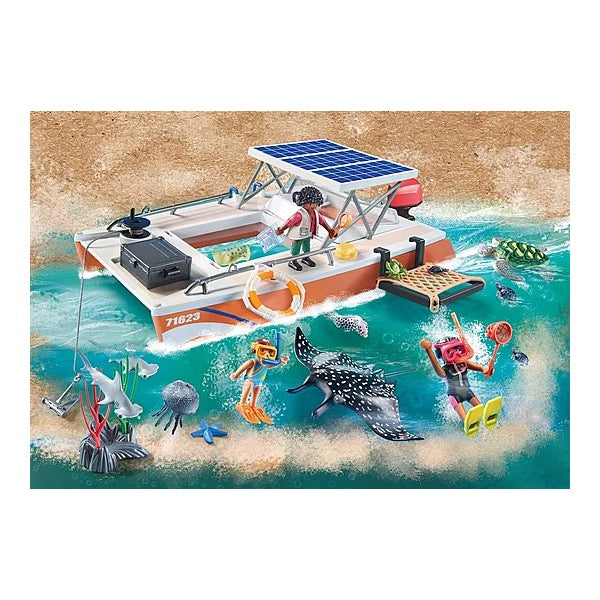Figures: 1x woman with diving equipment (Lu Palmer), 1x girl with diving equipment (Sofie), 1x man (Australian captain) Animals: 1x jellyfish (swimming, attached to stick), 1x manta ray, 1x stingray, 2x hammerhead shark babies, 1x starfish, 1x crab, 1x sea turtle, 3x turtle babies, 1x moray eel Accessories: 1x catamaran with solar roof and central transparent glass floor with magnifying glass function, 1x anchor, 1x external ladder, 1x boom with net, 1x stern motor, 1x case with various utensils
