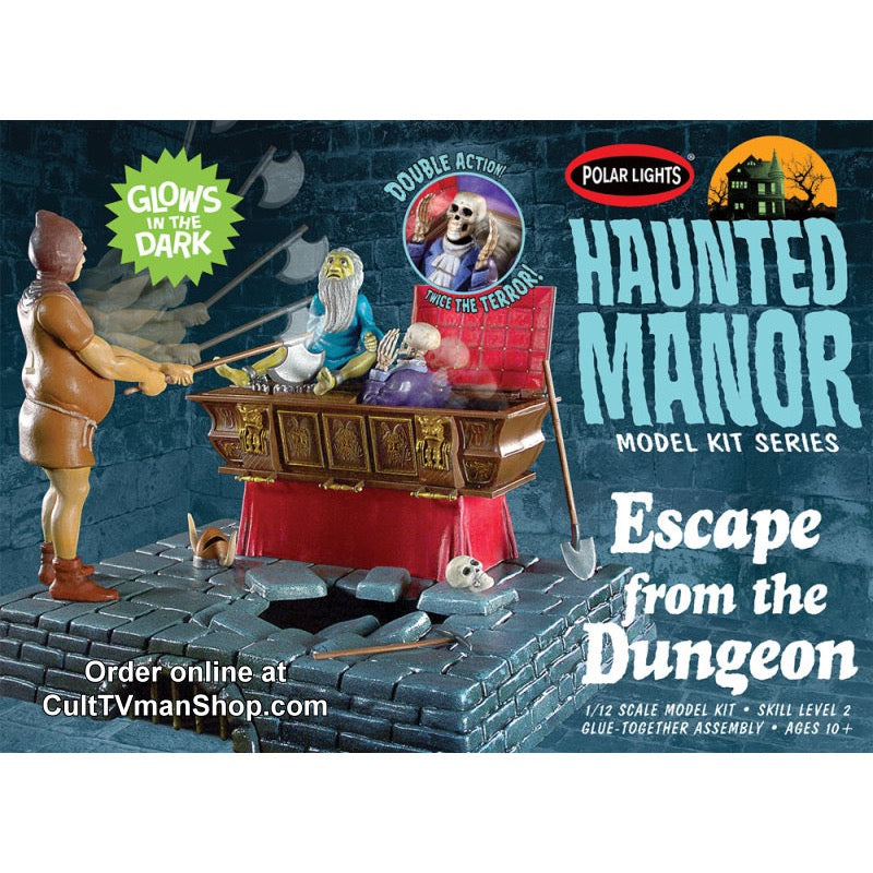 The Escape From the Dungeon glue-together model kit is the first release in the haunted Manor series of kits from Polar Lights that re-introduces fun, spooky models from years past. The kit features fine details on every part. It uses rubber band action to pring two moving figures. In Escape From the Dungeon, is the executioner offering a near miss or a favor that will free our diminuitive friend? In either case, another long-dead ghoul has something to say about it! The model base is 8 3/4 wide and 7 long. The plastic model even glows in the dark (if left unpainted).