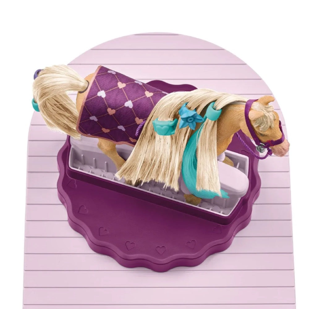 The grooming station is stocked with brushes, sponges and a hairdryer. You can even add colorful clips to your horse's mane, and don't forget the matching horse blanket and rider's vest. It's fashion and friends forever at the Horse Grooming Station from schleich!