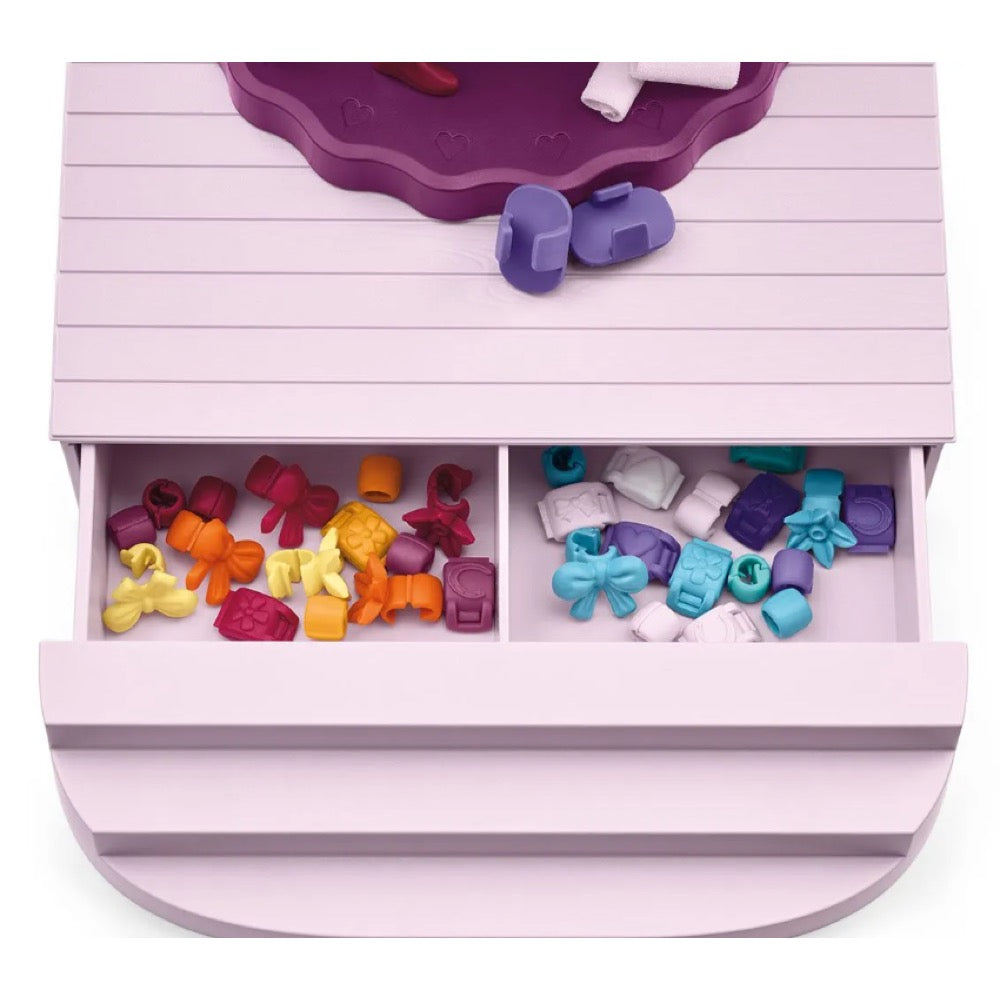 1x Beauty Horse, 1x human figure, 1x horse grooming station, 1x drawer, 12x hair clip, 14x hair pearl, 4x hair flower, 4x hair bow, 1x finger comb, 1x finger sponge, 1x hair brush, 1x hair dryer, 1x horse blanket, 1x vest, 1x hair strand, 4x gaiters, 1x bracelet