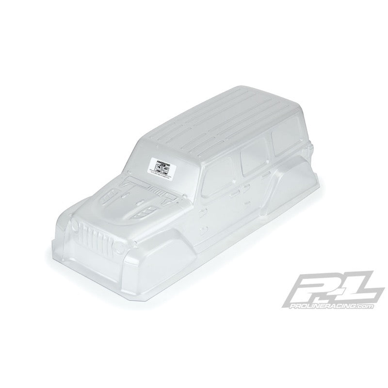 This is the Pro-Line JeepŒ¬ Wrangler JL Unlimited Rubicon Clear Body. The new JeepŒ¬ Wrangler JL Unlimited Rubicon body is ready for adventure! Rugged, tough and soon to be classic styling are now available from Pro-Line for 1:10 Scale Builders and Rock Crawler owners. It's fully licensed JeepŒ¬ styling is a perfect match to the full-size counterpart and is destined to become an automotive classic. The JL features an all-new rear tail-light and tail-gate design, bigger windows for better visibility, higher clearance fenders to allow for bigger tires and new hood details that all come together to give you a better rock crawling experience. If you are JeepŒ¬ fan, then the new Wrangler JL Unlimited Rubicon is a must-have body for your 12.3" rig. Get yours now!