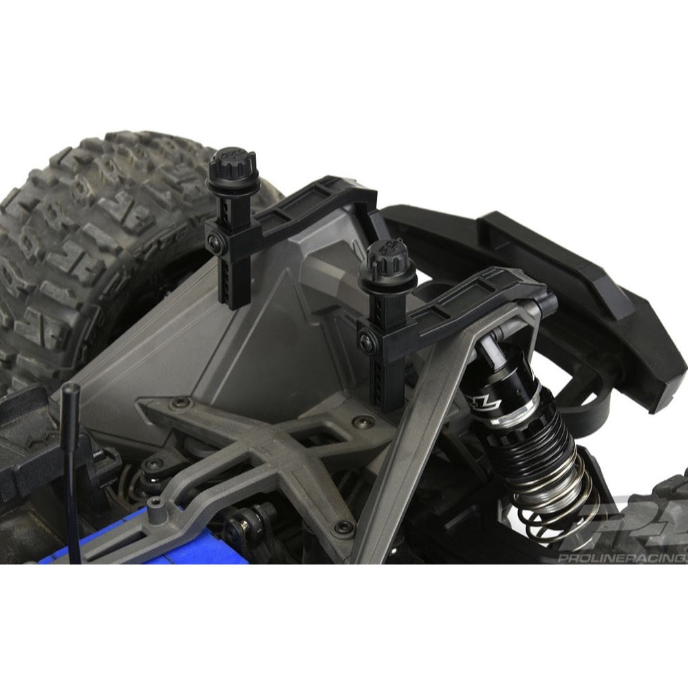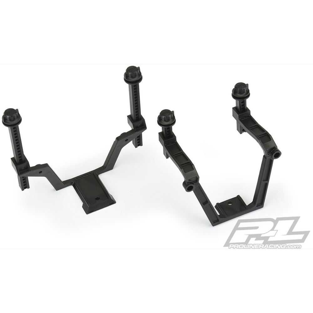 This is an Extended Body Mount Kit with Secure-Loc Caps for the MAXX®. Pro-Line continues to innovate with more must-have accessories for your truck. The all-new Pro-Line body mount kit includes adjustable body mounts so you can fit different bodies onto your MAXX®! But Pro-Line Engineers did not stop there. Instead of just using the stock body mounting system that always causes your body to pop off and go flying, the Pro-Line Extended Body Mount kit includes a revolutionary screw-on body mounting system for a strong and secure mount every time. No more doing the walk of shame to pick up your lost body! Just screw down the included setscrew into the body mount, place the O-Ring over the setscrew and mount your body as you normally would, but with the added safety, security, and styling of Pro-Line's innovative screw on body mounting system! This body mount system opens many new body options that you didn't have before.