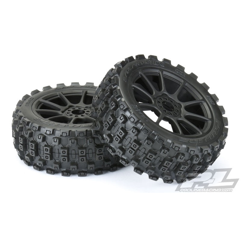 Now these iconic Badlands MX Tire is Pre-mounted on Mach 10 Black Wheels so you don't have to worry about gluing your own tires or waiting for them to dry. All you need to do is slap them on your buggy and get to ripping up the dirt! The Mach 10 features 10 aggressive spokes that will make your off-road bash buggy look fast even sitting still. The Mach 10 wheels have a 17mm hex and are made from a single molded piece of high-quality Nylon proudly produced by Pro-Line in the USA! Be the first on your block to get the all-new Badlands MX tires