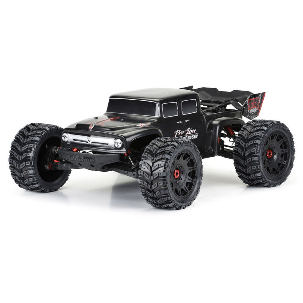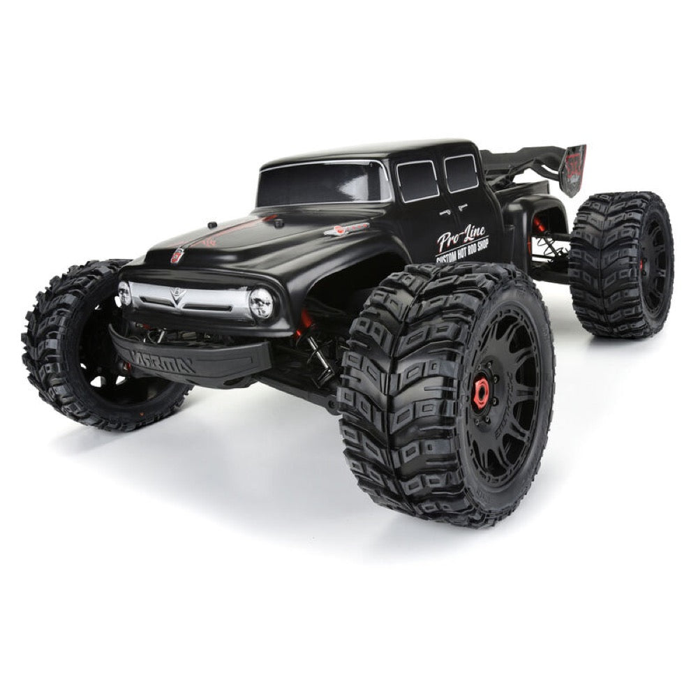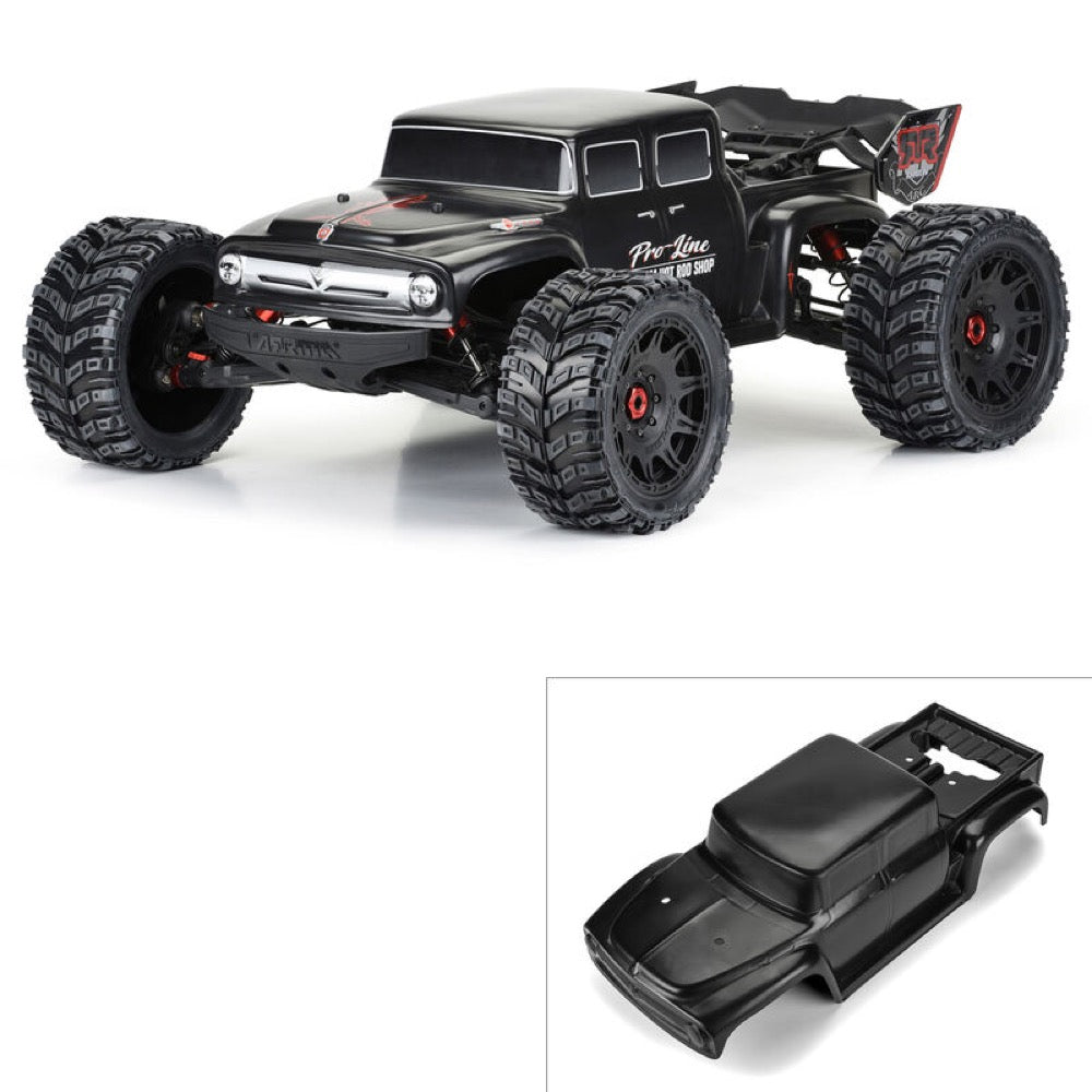 This is a Pre-Cut 1956 Ford® F-100 Bash Armor Black Body for Kraton™ 8S. Pro-Line is excited to bring retro classic styling with the highly durable Bash Armor material! This old-school Ford® F-100 body completely transforms the look of your truck, featuring a custom hot-rod style extended cab, aggressive fender flares, and the iconic old-school chrome grill of the '56 blue oval fan favorite.