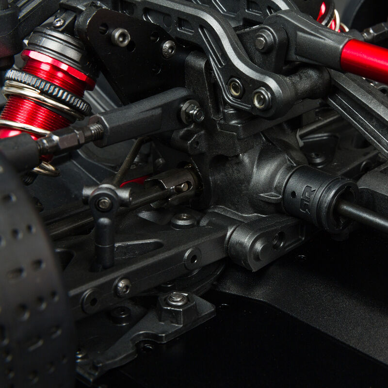 Underneath those streamlined Street Bash looks is a chassis which proves to the world, once again, that ARRMA® builds the most durable bashers. The 6061-T6 anodized aluminum chassis houses a heavy-duty drivetrain with steel driveshafts, plus all-metal diff outdrives and gearbox internals. Updated internal gears feature a new tooth profile for increased strength. A lower internal gear ratio reduces the center line transmission RPM, reducing the center drive shaft resonance and increasing drivetrain durability. Chassis toughness is reinforced with a center brace. Bearings are rubber-shielded, and the adjustable, oil-filled, anodized aluminum shocks are mounted on strong, black-anodized aluminum shock towers.