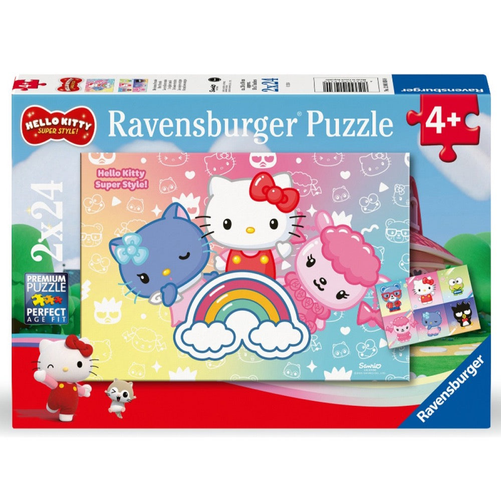 The Ravensburger Hello Kitty Puzzle set includes two 24-piece puzzles designed for young fans of the beloved character. Each puzzle measures 26 x 18 cm and features colorful Hello Kitty scenes that spark joy and imagination.