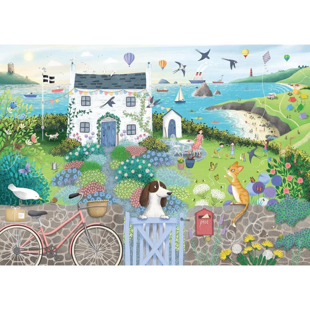 As you delve into this intricate 1000 piece jigsaw puzzle, you'll find yourself immersed in a coastal wonderland. At its heart is a charming cottage, perched right by the water's edge. The coastal landscape comes alive with a vibrant array of details. Seagulls soar overhead, people have set up camp nearby, enjoying the breathtaking view, while boats gently bob on the tranquil waters. At the cottage gate, a loyal dog stands sentinel, ever watchful of the surroundings. A cat perches on the wall, a silent observer of the coastal scene. A bicycle leans against the wall, hinting at leisurely rides along the shoreline. The presence of people on the beach complete the image. Whether you're a beach lover or simply yearning for a coastal escape, this puzzle promises hours of entertainment as you piece together the idyllic charm of life by the sea.