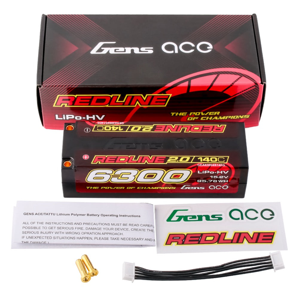 Gens Ace Redline 2.0 Series 140C 6300mAh 4s Hardcase LiPo Battery Pack, with a factory installed 5.0mm bullet. Consumers trust the Gens Ace name to deliver the dependability and high performance they expect. The Gens Ace Redline 2.0 LiPo battery pack has a high-capacity, high-discharge rate that gives you the power and run-time you expect.