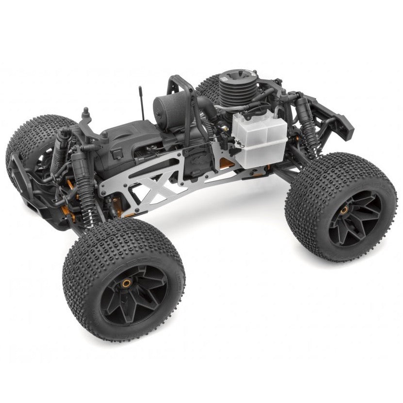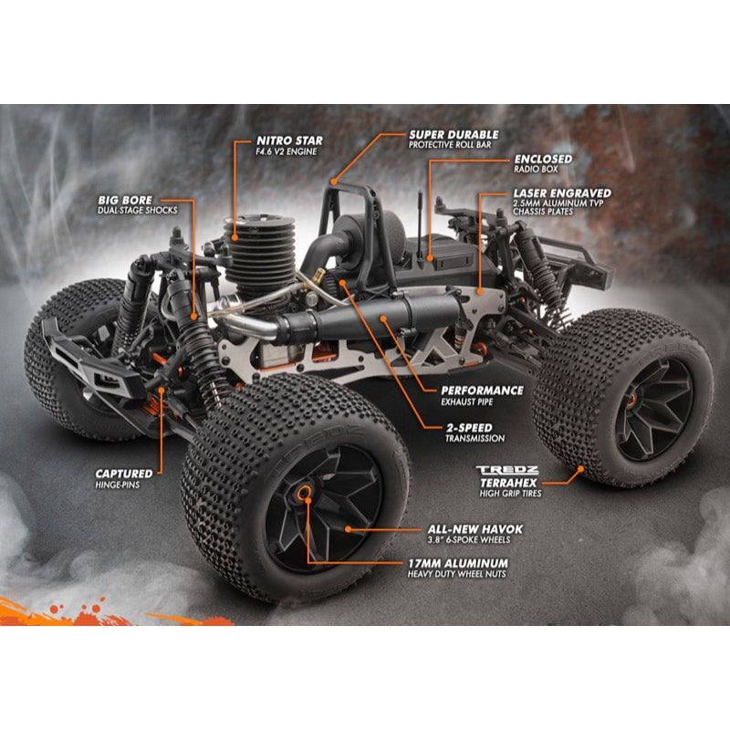 With a raft of NEW features including 17mm Aluminum Hex Hubs, all hex hardware, new bumpers, new body, wheels & tires, new Super HD Drivetrain (From the Savage FLUX), new Captured Hinge Pins, HD Servo Saver spring, 0.9mm Clutch Springs for boosted torque & acceleration and a new RF-50N Nitro Receiver. So whether you're a Savage rookie or an OG - You will not be dissapointed with the latest and greatest Big Block Nitro Savage!!