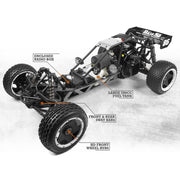 With extra-tough drivetrain parts like the viscous torque differential, super-durable composite spur gear with internal damping and all-metal drivetrain, the HPI Baja 5B is ready for your 23-32cc 2-stroke engine so you can experience the joy of gas-powered RC and up to 30-minute runtimes!