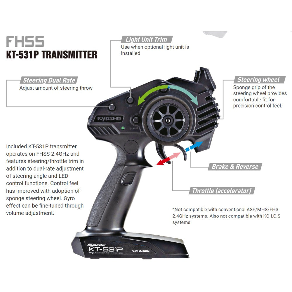 Included KT-531P transmitter operates on FHSS 2.4GHz and features steering/throttle trim in addition to dual-rate adjustment of steering angle and LED control functions. Control feel has improved with adoption of sponge steering wheel. Gyro effect can be fine-tuned through volume adjustment.