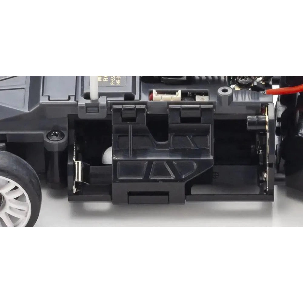 • The car is powered by four AAA alkaline or rechargeable nickel-metal hydride batteries. The batteries are mounted lower than the MR-03, lowering the center of gravity of the entire chassis to deliver improved cornering stability and straight-line handling.