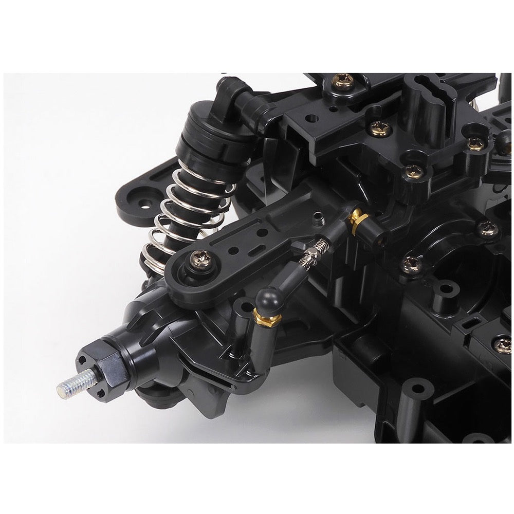 The 2WD BT-01 chassis gives the choice of two types of wheelbases, and front-or rear-wheel drive system. Without removing the battery pack, motor, and R/C equipment setups from the centre frame, simply change attachment directions of final gears and steering linkage to switch between front-and rear-wheel drive; front (FR) or midship rear (MR) motor position can be chosen for rear-wheel drive cars. The 4-wheel double wishbone suspension features symmetrical structure and friction dampers. Unitized sections such as the motor mount, final gears and suspension facilitate ease of assembly and effective maintenance.