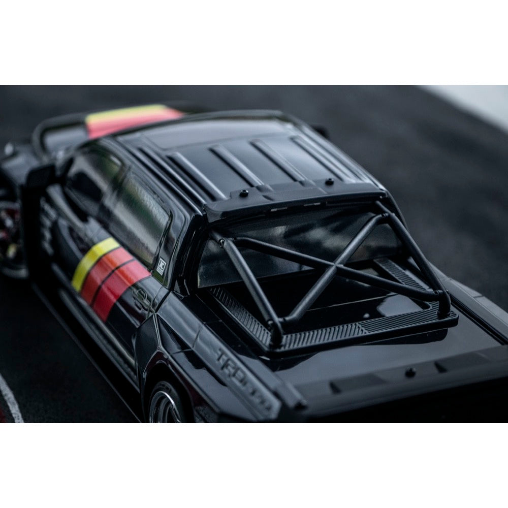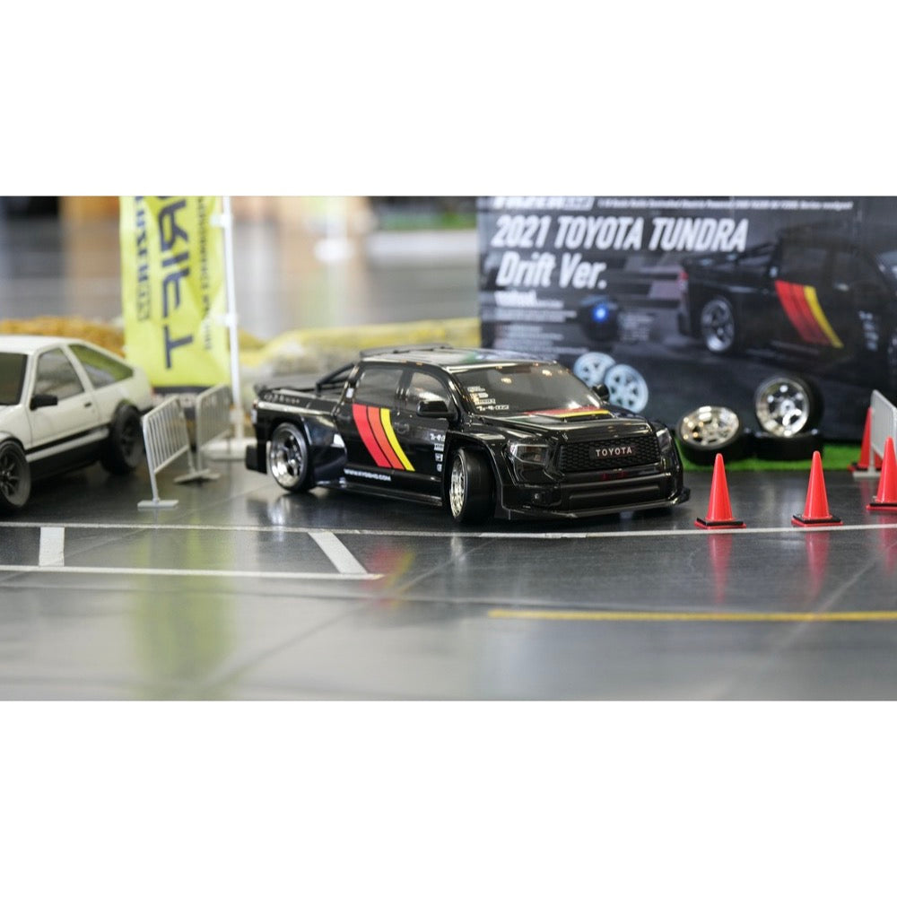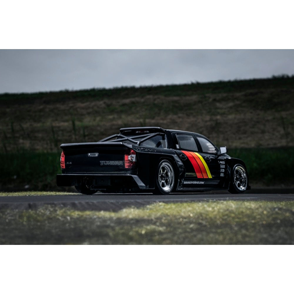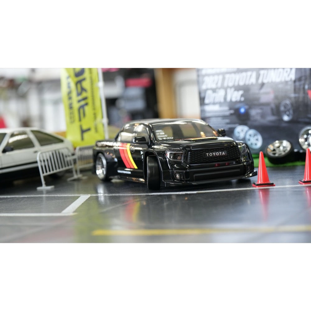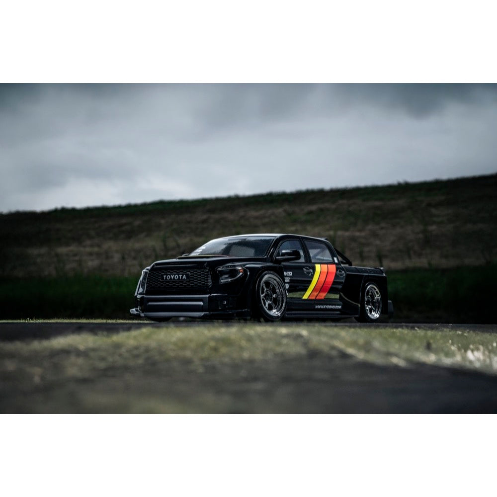 The Toyota Tundra is a full-size pickup truck proudly sold by Toyota in North America. Among its range, the TRD Pro stands out as the ultimate off-road grade, carrying the renowned TRD (Toyota Racing Development) name. This model is based on the 2021 Toyota Tundra TRD Pro and has been extensively refined with Kyosho’s original wide overfenders for an expanded stance, while custom aerodynamic features enhance both style and performance. Additional highlights include three signature racing stripes and a roll cage mounted in the cargo bed— hallmarks of custom pickup builds, giving the Tundra Drift Version its bold, distinctive character.