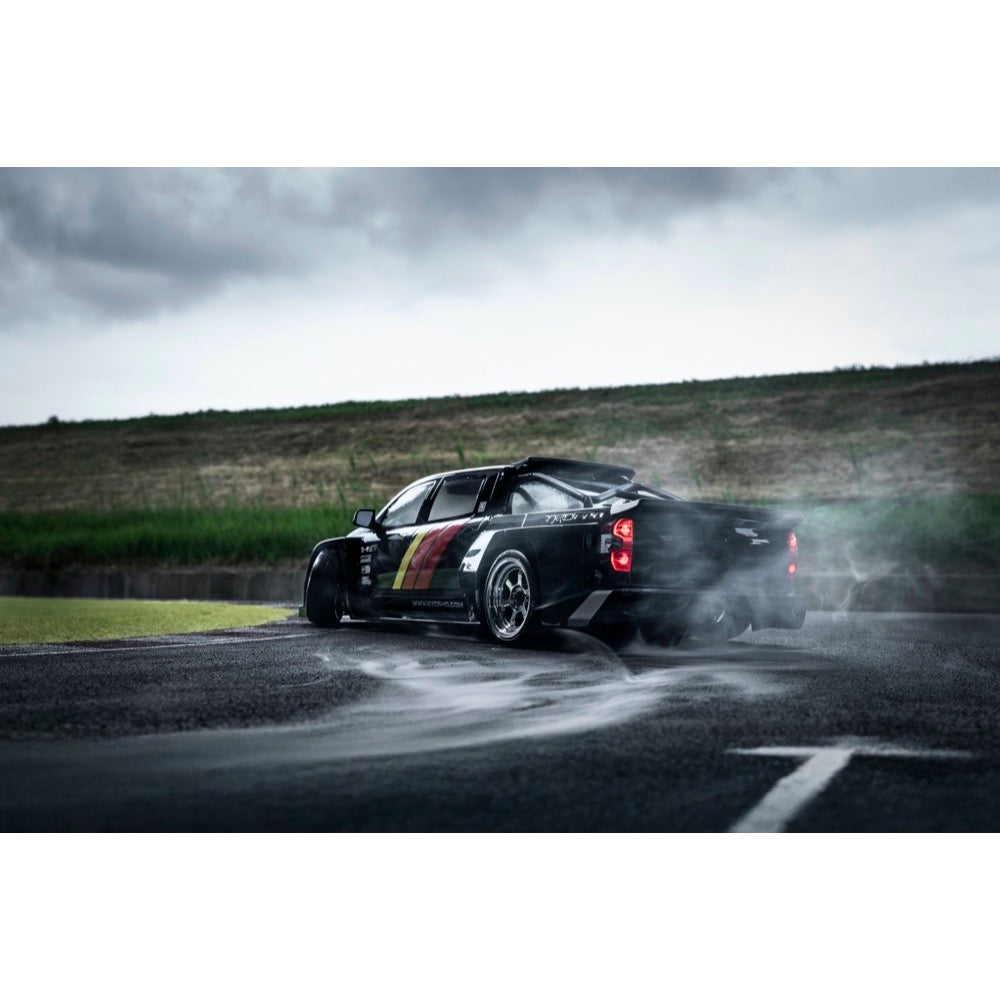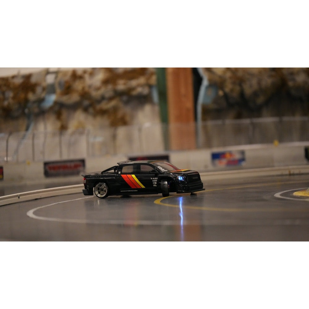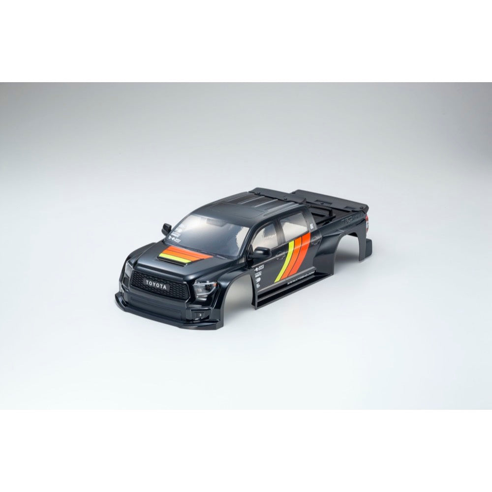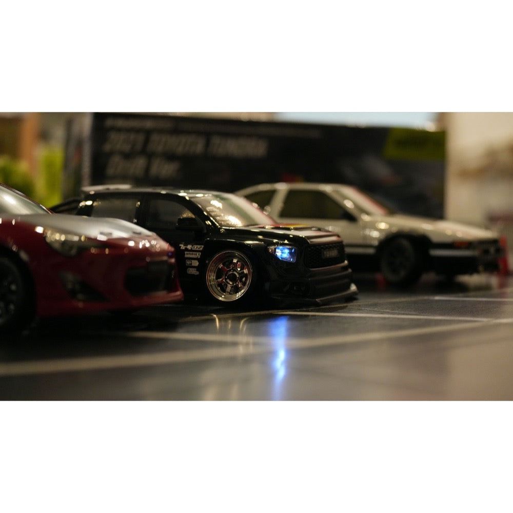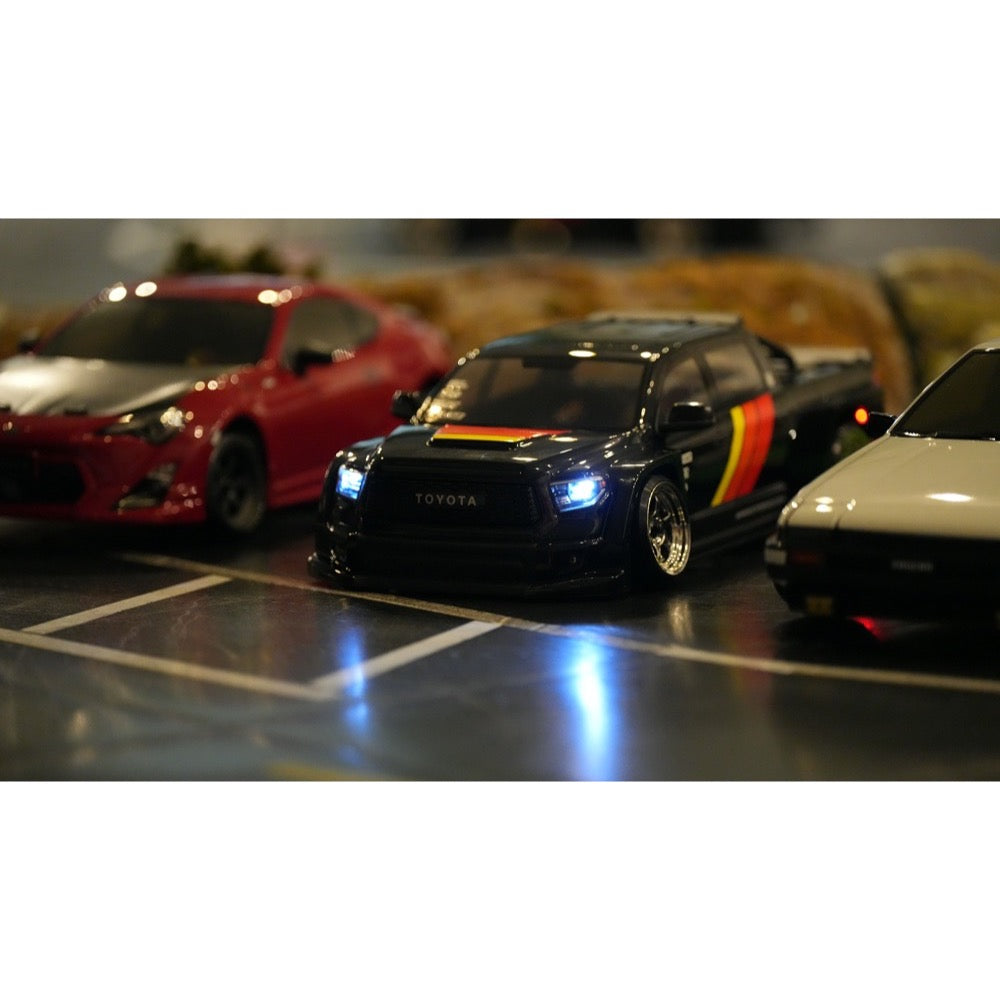The Toyota Tundra is a full-size pickup truck proudly sold by Toyota in North America. Among its range, the TRD Pro stands out as the ultimate off-road grade, carrying the renowned TRD (Toyota Racing Development) name. This model is based on the 2021 Toyota Tundra TRD Pro and has been extensively refined with Kyosho’s original wide overfenders for an expanded stance, while custom aerodynamic features enhance both style and performance. Additional highlights include three signature racing stripes and a roll cage mounted in the cargo bed— hallmarks of custom pickup builds, giving the Tundra Drift Version its bold, distinctive character.
