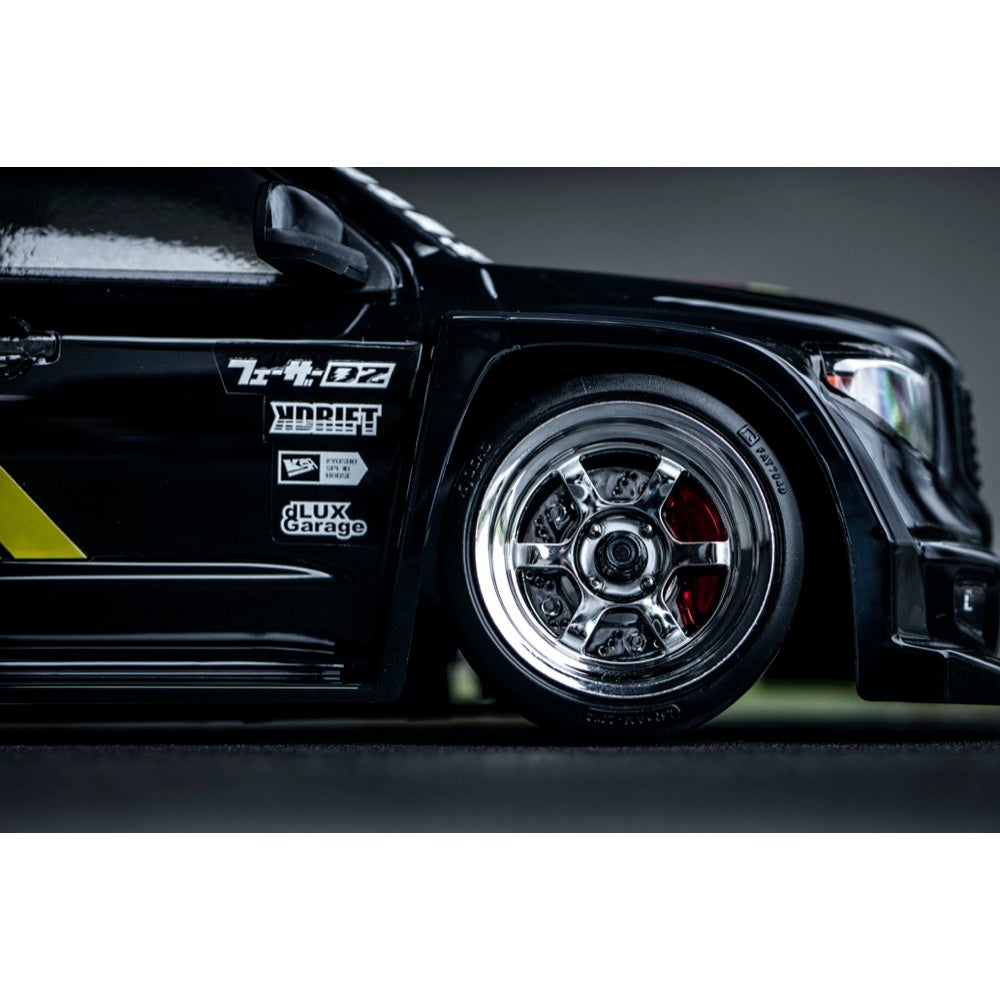 Wheel hubs are decorated with dummy brake calipers and discs, dramatically elevating the scale appearance. The rear drive unit uses a spool (rigid) axle without a differential function to support smooth drifting.