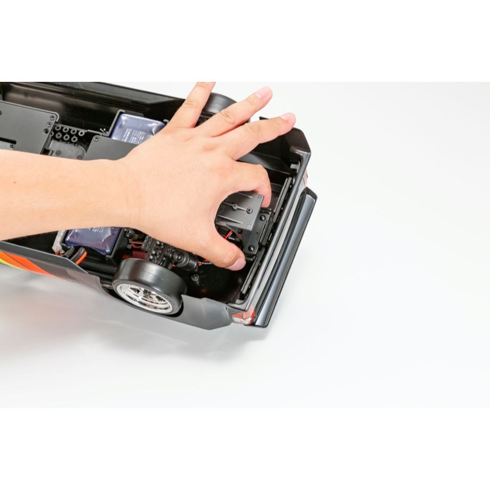 The ESC (Electronic Speed Controller) is mounted at the rear of the car to optimize weight distribution for drifting. The ESC is fixed in a special tray that can be removed with a single screw for easy maintenance.