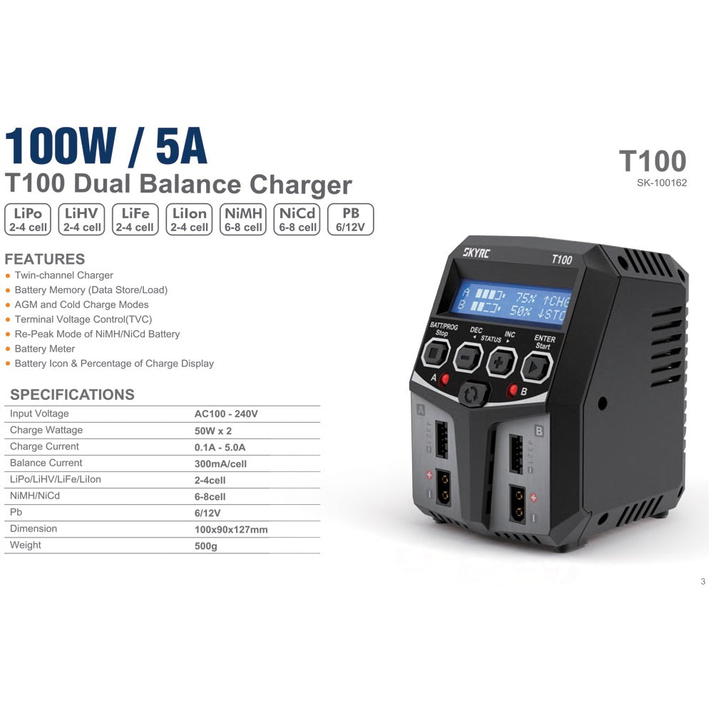 SkyRC T100 is a twin-channel charger with two independent circuits which can charge batteries of varying chemistries (LiPo / LiFe / Lilon / LiHV / NiMH / NiCd / Pb) simultaneously. For Pb battery, AGM Charge and Cold Charge mode are available.