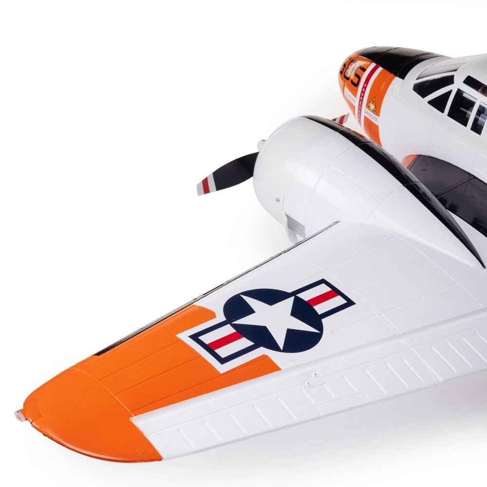 The factory-assembled airframe is equipped with an abundance of scale detail, including molded-in panel lines and hatches, antennas, exhaust stacks, a pilot figure, and more. Additionally, it's factory-finished in a fully painted white with orange and black Navy RC-45J (SNB-5P) navigation and photo reconnaissance trainer trim scheme.