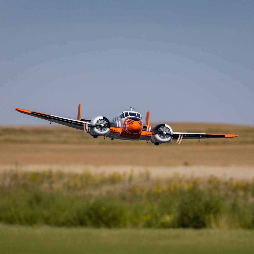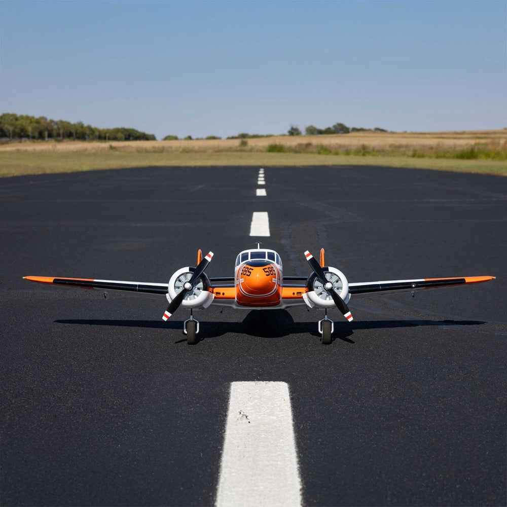 The E-flite Beechcraft D18/RC-45J 1.5m is the most convenient, capable, and easiest to fly scale model of one of general and military aviation's most recognizable aircraft! Its twin brushless power system, with specially tuned motors, delivers better-than-scale-like performance when using 3S 3200-5000mAh batteries. Or it can deliver even more speed and unlimited vertical performance with a 4S battery – no modifications or upgrades required. It's also equipped with an exclusive Spektrum Avian Dual 40-amp Smart Lite ESC, which can provide a variety of real-time power system telemetry data with both Smart and non-Smart batteries via compatible receivers (including the AR631+ installed in the BNF Basic version) and Spektrum AirWare-equipped transmitters. The BNF Basic version is also the only Twin Beech model equipped with enhanced AS3X+ and optional-use SAFE Select technologies, making it the easiest to fly D18/RC-45J yet. Factory-finished in a highly visible and fully painted white with orange Navy trim scheme, the lightweight yet durable, composite-reinforced EPO airframe features an abundance of scale detail - molded-in panel lines and hatches, antennas, exhaust stacks, a pilot figure, and more. Included functional flaps, twin rudders, and LED navigation lights elevate your experience to the next level. Factory-installed electric retracts with durable metal components make it possible to take off from a wide variety of surfaces, including paved runways, packed dirt, and even grass. The unique 3-piece wing design makes storage and transport as convenient as possible, as the center section houses the main gear, and all sections feature innovative hands-free connections. Best of all, because no glue is required for final assembly, you can have the Beechcraft D18/RC-45J 1.5m ready to fly in less time than it takes to charge a battery!