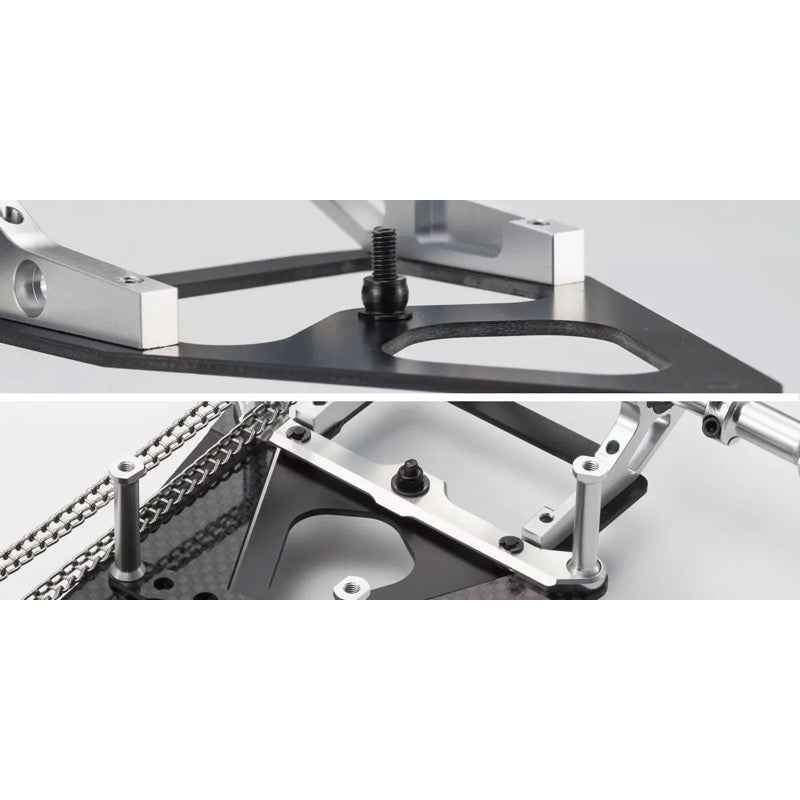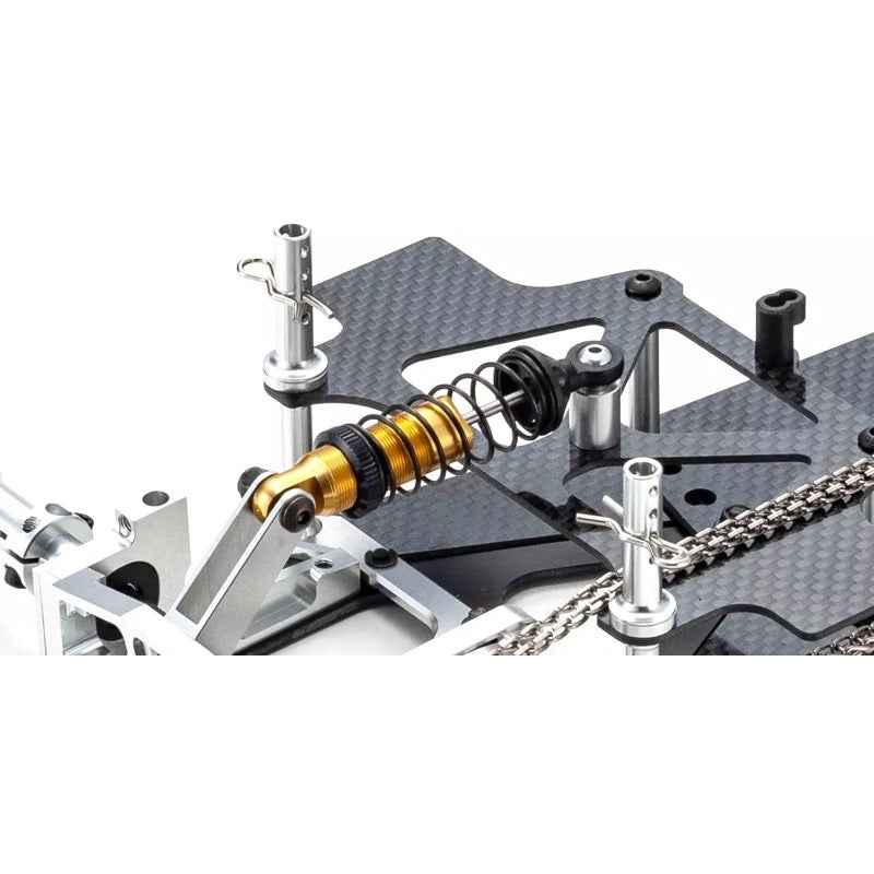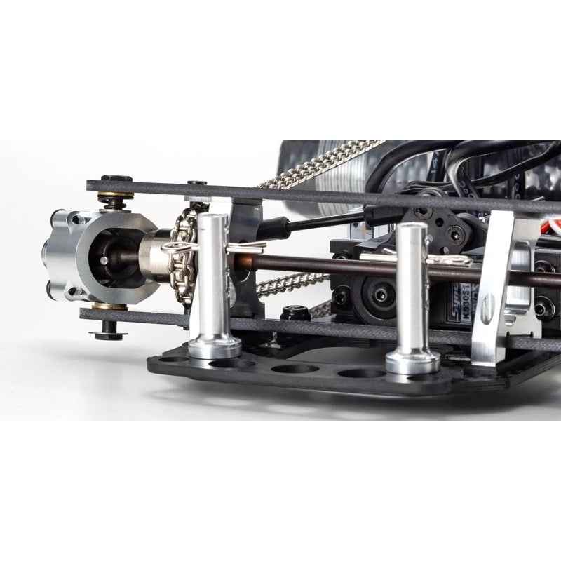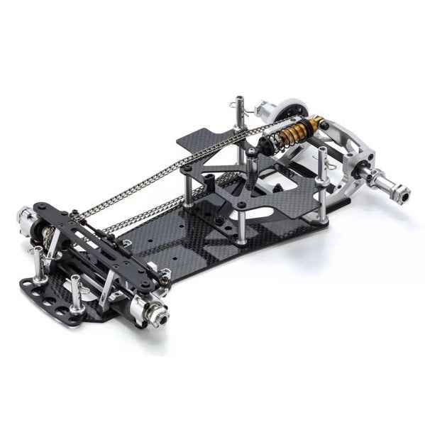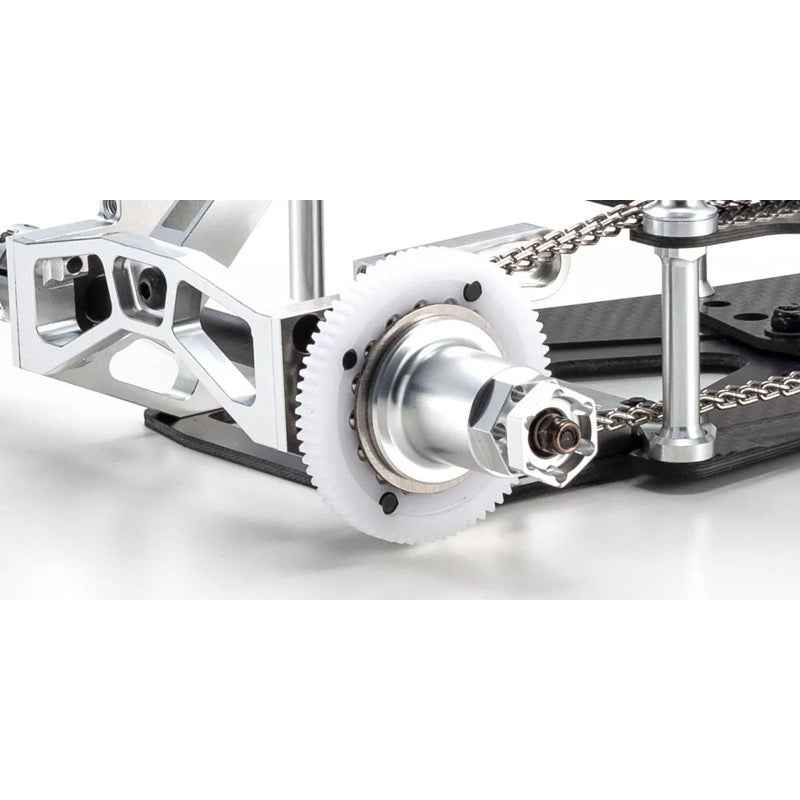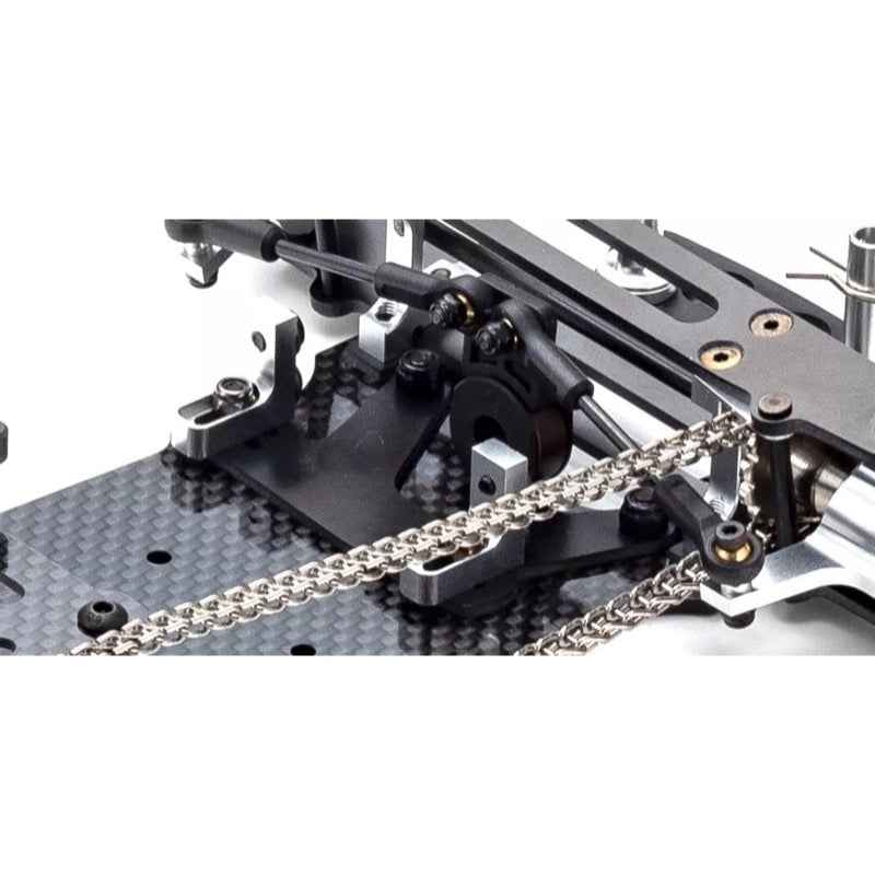 • Carbon fiber main chassis, based on the reproduced Plazma MK.3 Limited, is optimized for chain drive. Precision milling minimizes chain interference, while a relocated servo mount balances moderate flex with high rigidity for improved cornering performance.