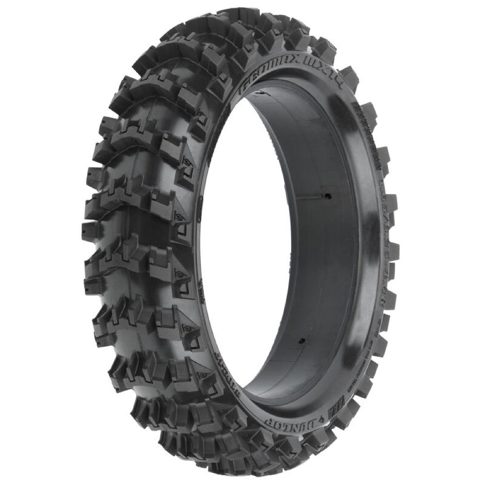 This is a Dunlop MX14 Rear Tire Premounted on the Pro-Spec Aluminum Wheel Sleeve for the Losi® Promoto MX. Introducing another exciting collaboration between Pro-Line and Dunlop Motorcycle Tires: The Geomax MX14! This is a top choice of both pro and amateur motocross racers worldwide, and now we're bringing Dunlop's legendary style and performance to the Losi® Promoto-MX RC dirt bike!