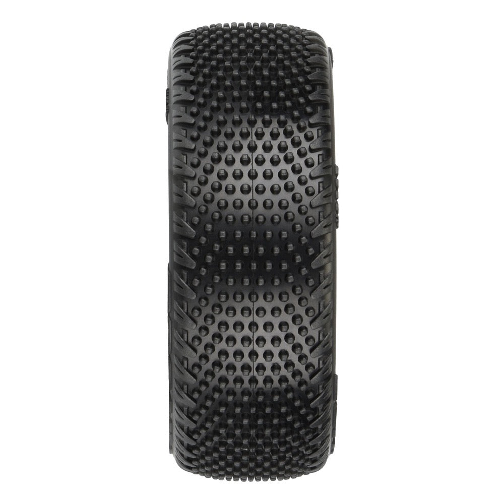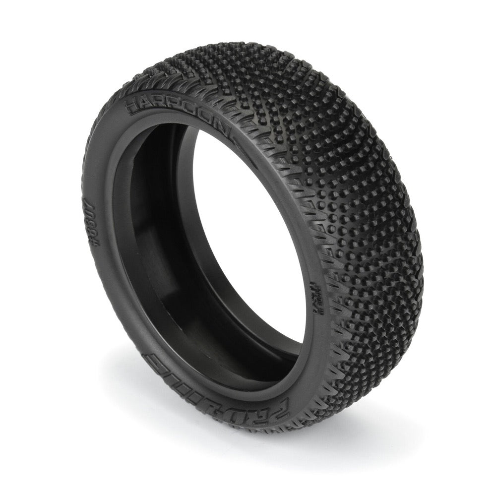 Introducing the Harpoon, Pro-Line's latest and greatest solution for high-grip 1/10 Carpet Buggy Racing. The Harpoon features a unique, modern pin design with a round base for more support and longer wear. The directional pin layout gives the racer options to tune forward and site bite characteristics depending on track conditions. A narrow, lower profile carcass improves agility and reduces sidewall fold-over. The outside harpoon-shaped lugs increase high-speed cornering stability in high grip conditions, reducing the need for sidewall CA gluing.