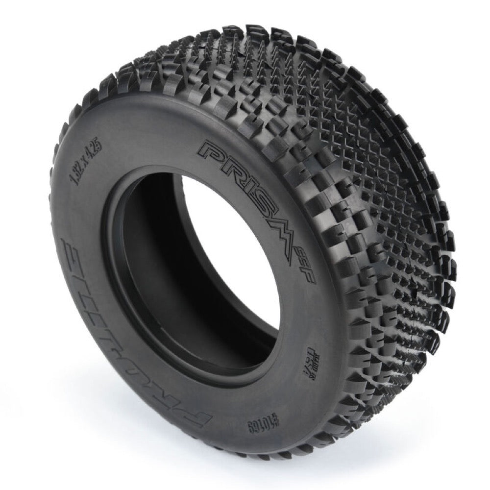 This is a pair of Prism SC Front Tires. Introducing the all-new Prism Short Course front tire for Carpet Off-Road Racing! The Prism Front SC tire features tons of Ultra-Sharp Prism shaped Pins in the middle of the tire combined with Wedge style pins on the outside for incredible steering on small and tight carpet tracks without the edgy feel of full pin tires. The pins on the Prism are slightly smaller than the original Pin Point rear tire but there are many more of them, which results in faster and more consistent lap times. The Prism pins have been positioned with the knife edge pointed front to back and side to side for maximum grip and to stay sharp even as they wear down. The Prism Front tire perfectly pairs with Pro-Line's Prism SC Rear (PRO10148) tire for ideal carpet racing performance. This Prism Front tire is destined to change the carpet racing scene; be the first one with the fastest carpet tire yet, Pro-Line's Prism Front!