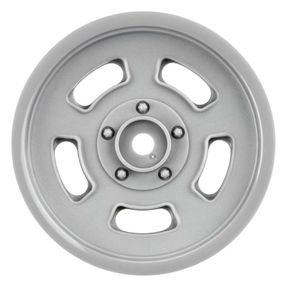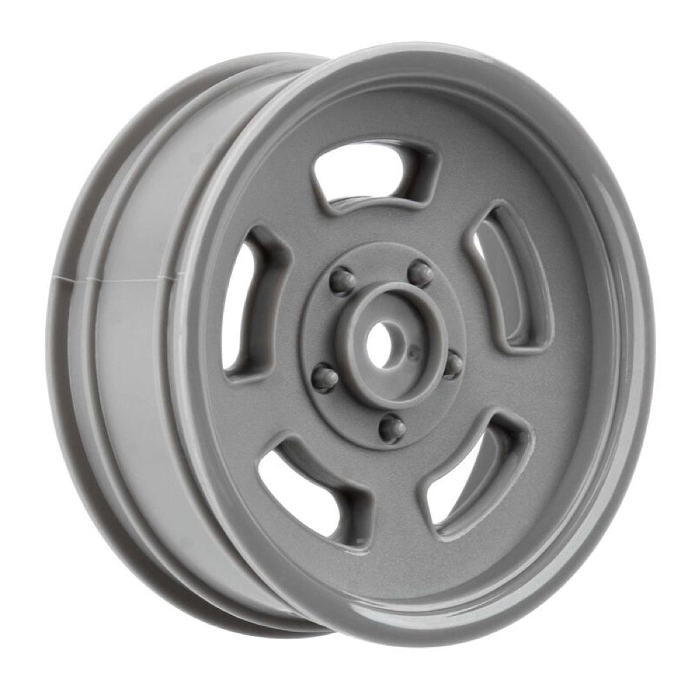 This is a pair of Slot Mag Drag Spec 2.2" Stone Gray Front Wheels. Pro-Line is kicking it back old-school with Slot Mag style wheels for your no-prep SC drag car! Slot Mag style wheels have been a staple wheel design in racing for many decades and Pro-Line is proud to bring it to you in 2.2" Stone Gray color plastic front wheels. The outside ring of this wheel has a shiny, polished finish while the spoke detail is textured with a matte finish to match the look and feel of the real thing! The Slot Mag wheels were specifically made for no-prep Drag racing and are a perfect fit with Pro-Line's Hoosier Drag 2.2" Front Tires!