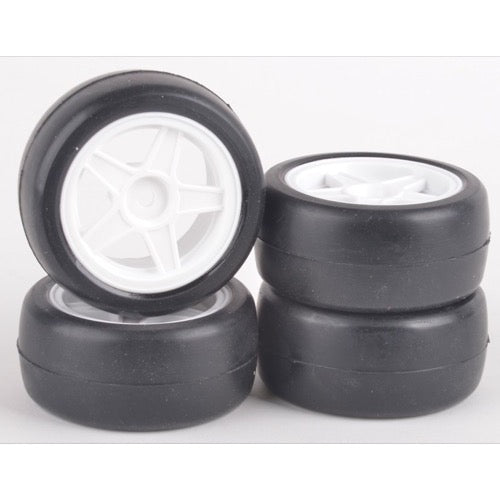 Excellently pre-glued Tamiya mini tyres, new 5 spoke design wheel in 'Flex' material, more grip and less chance of breaking.