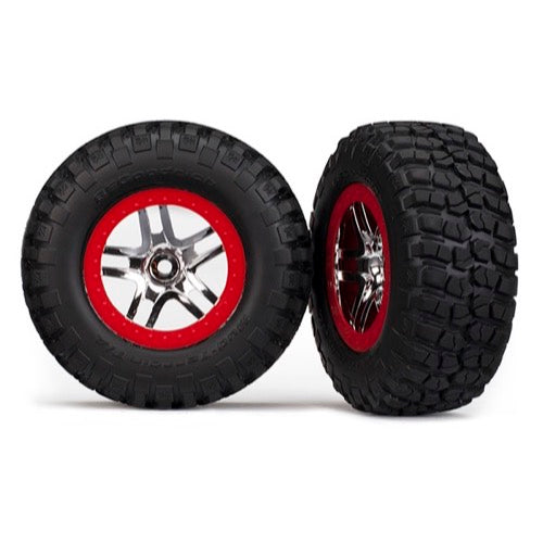 Pair of BFGoodrich® Mud-Terrain™ T/A® KM2 tires come pre-glued and mounted with foam inserts to chrome Split-Spoke SCT wheels with red beadlock-style trim. Fits 12 mm hex, 2WD front only.