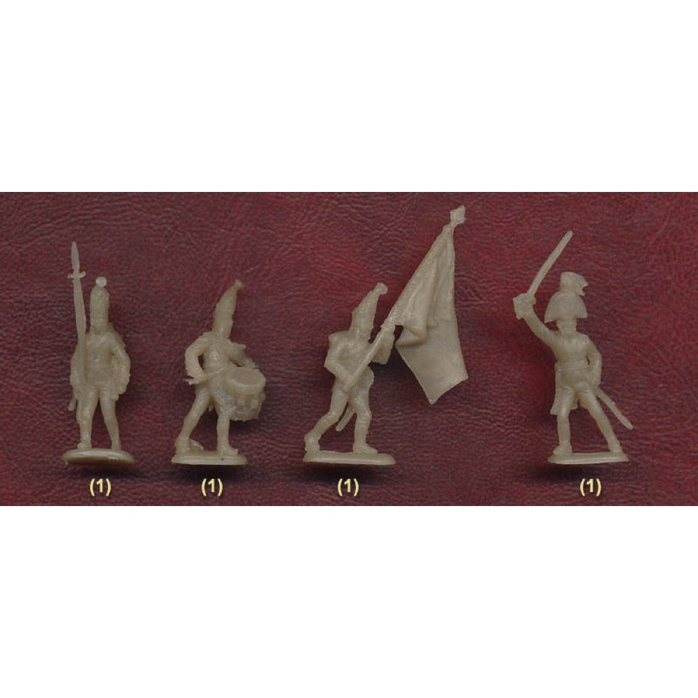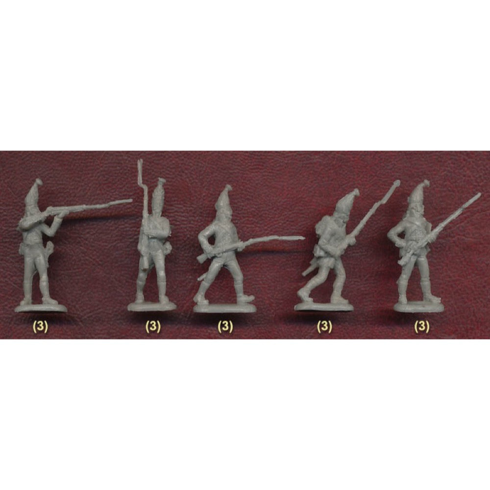 As with any army of the day, a large part of the Russian infantry was made up of grenadiers. Traditionally the strongest men who could throw a grenade, by the Napoleonic Wars this function had long disappeared from land warfare, and they were instead heavy infantry but still seen as the best of the Line Infantry. The year 1804, when this set dates itself from, saw the grenadiers gradually returning to a modern uniform rather than the old-fashioned Frederickian Prussian uniforms introduced under Paul. They now wore the coat with shorter tails and lapels fully closed to the waist with two rows of buttons. They wore breeches with boots in the winter, which is what all these figures are wearing, but they still had the tall mitre cap with metal front plate and headband decorated with grenades (but no chinstrap). They carried the cylindrical knapsack or valise, to which was attached a mess tin and, from 1805, a rolled greatcoat. The cartridge pouch on the right hip (with grenadier decoration) and sabre on the left completed the outfit, which is correctly modelled here. In 1805 it was decreed that the grenadier mitre cap should be replaced by a shako, but naturally this took years to implement, partly simply to save the expense of replacing almost new mitres, and several regiments continued to wear the mitre for several more years. Inevitably mention needs to be made here of the Pavlov regiment, who still had the mitre in mid-1807, and were allowed to keep it in perpetuity in recognition of their gallant action at Friedland, but other grenadiers would also have retained this look into 1808, so the dates for this set make perfect sense.