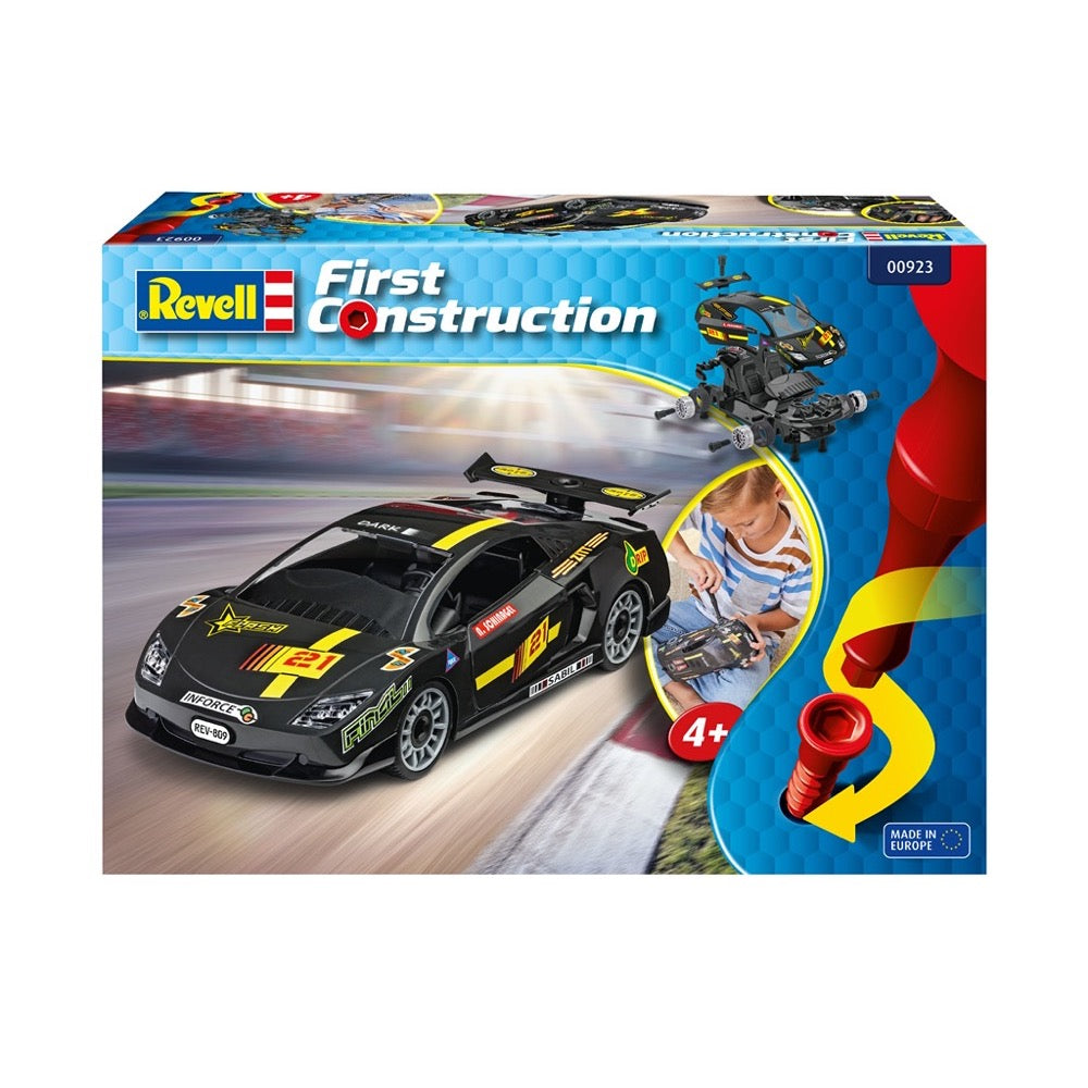 On the screws, get set go! Like a real mechanic in the pit lane, you assemble this cool racing car from Revell First Construction yourself. The black racer is assembled step by step from 22 colored individual parts and screwed together - and then authentically decorated with lots of stickers. Length about 24 cm.