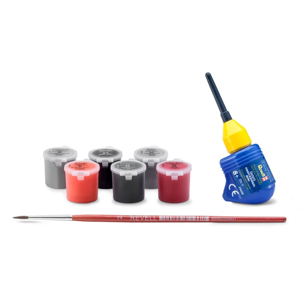 Plastic model kit (non-assembled), Illustraded, multilingual assembly instructions, Decal set, Base colors (Revell Aqua Color), Adhesive (Revell Contacta Professional Mini), Brush