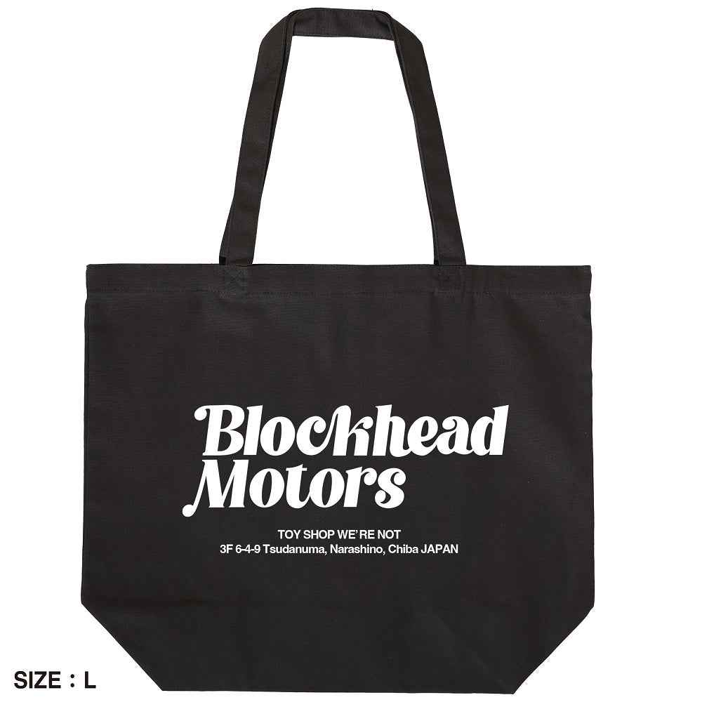 This black tote bag features the BLOCKHEAD MOTORS script logo. Available in three sizes: M, ML, and L. 100% cotton, single-sided print.