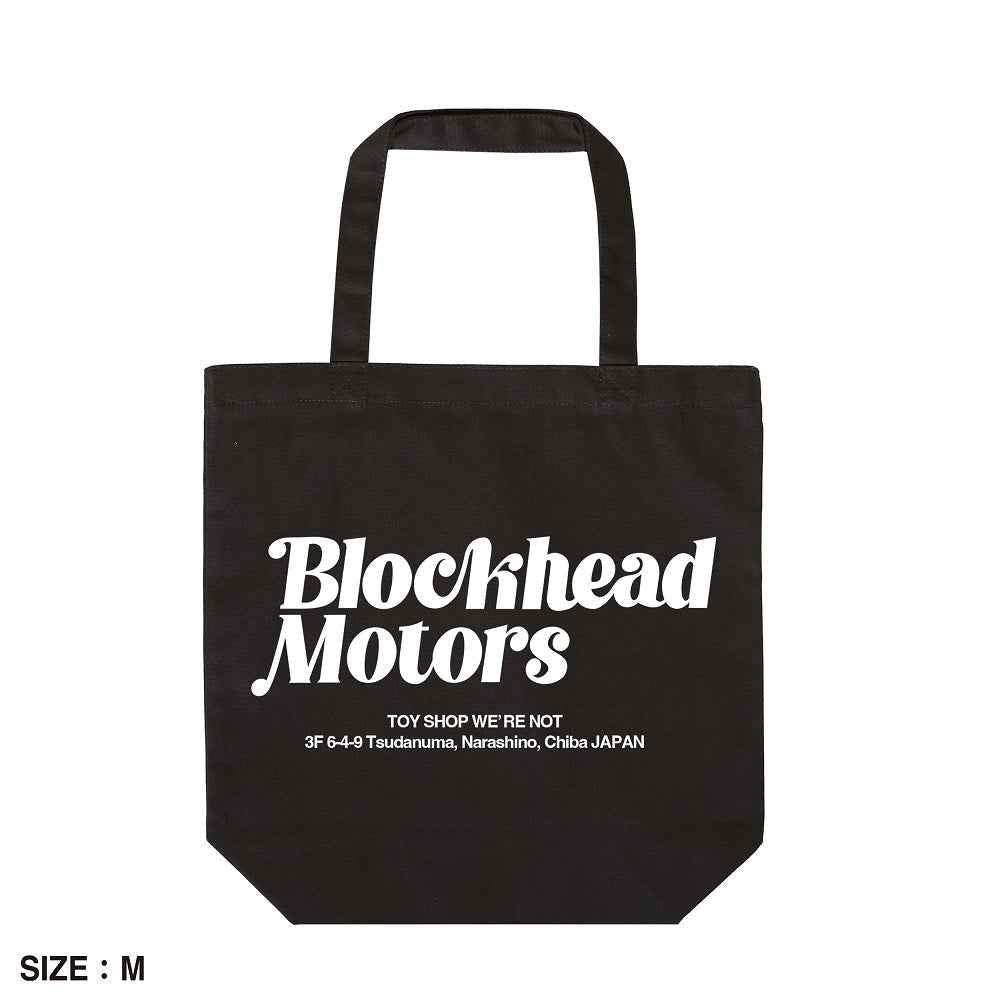 This black tote bag features the BLOCKHEAD MOTORS script logo. Available in three sizes: M, ML, and L. 100% cotton, single-sided print.