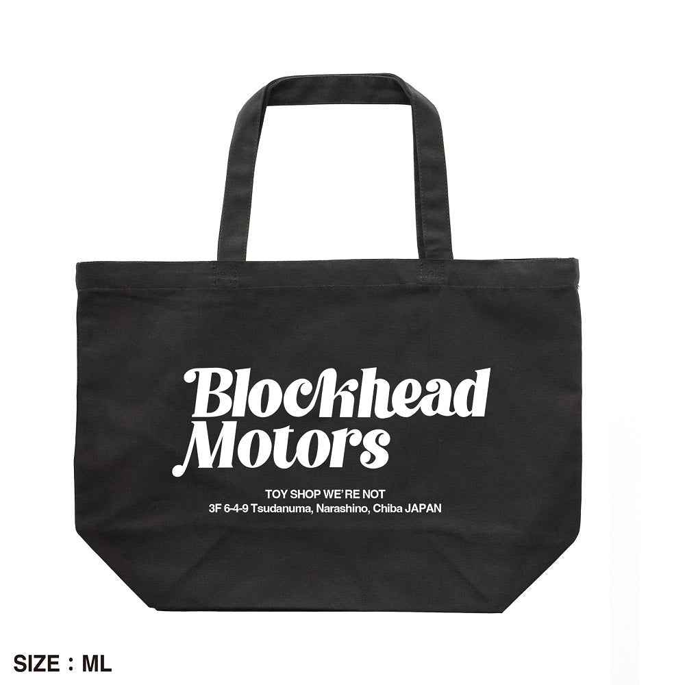 This black tote bag features the BLOCKHEAD MOTORS script logo. Available in three sizes: M, ML, and L. 100% cotton, single-sided print.