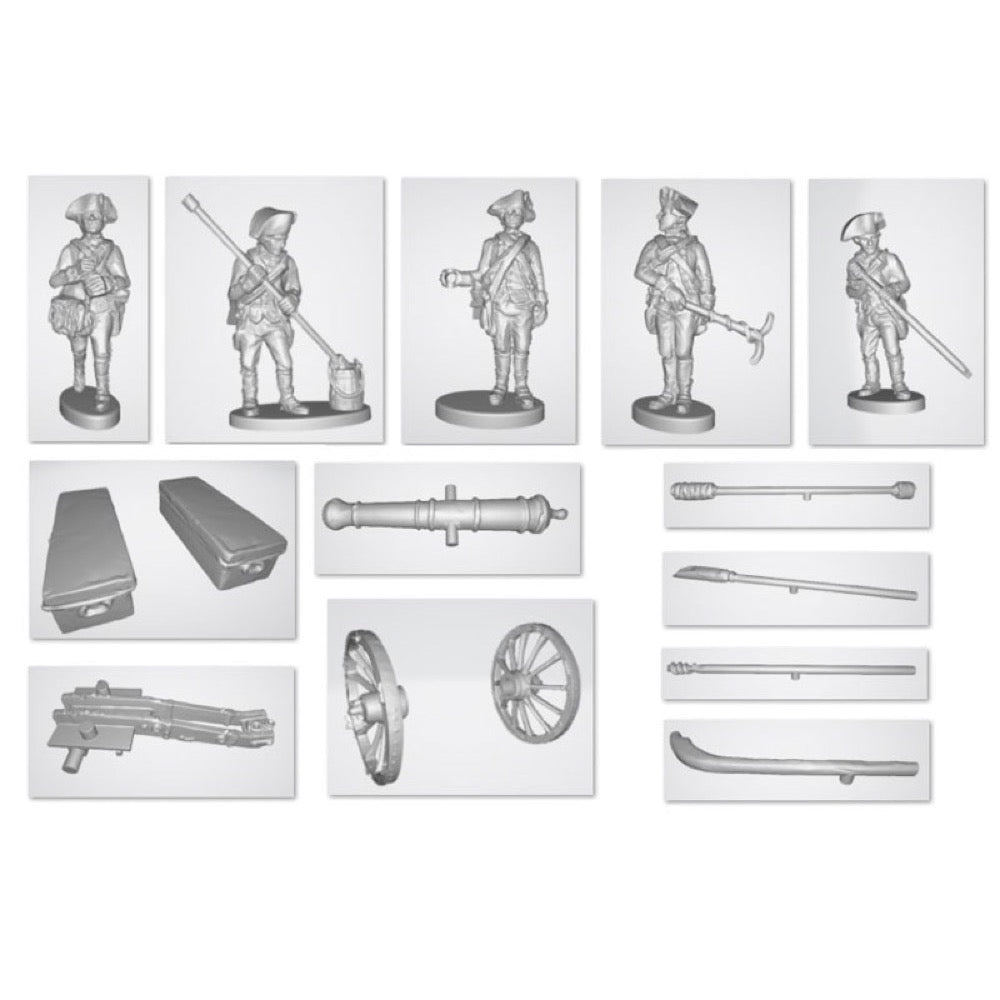 This 1/72 scale British Artillery set from Hat Industrie represents gun crews as they would have appeared during the American War of Independence. Sculpted with period uniforms and equipment, the figures are intended to complement infantry and cavalry units of the era, making them well suited to battlefield layouts, siege scenes or wargaming tables. The poses reflect the practical roles of artillery crews, focused on operating and supporting their guns rather than dramatic action.