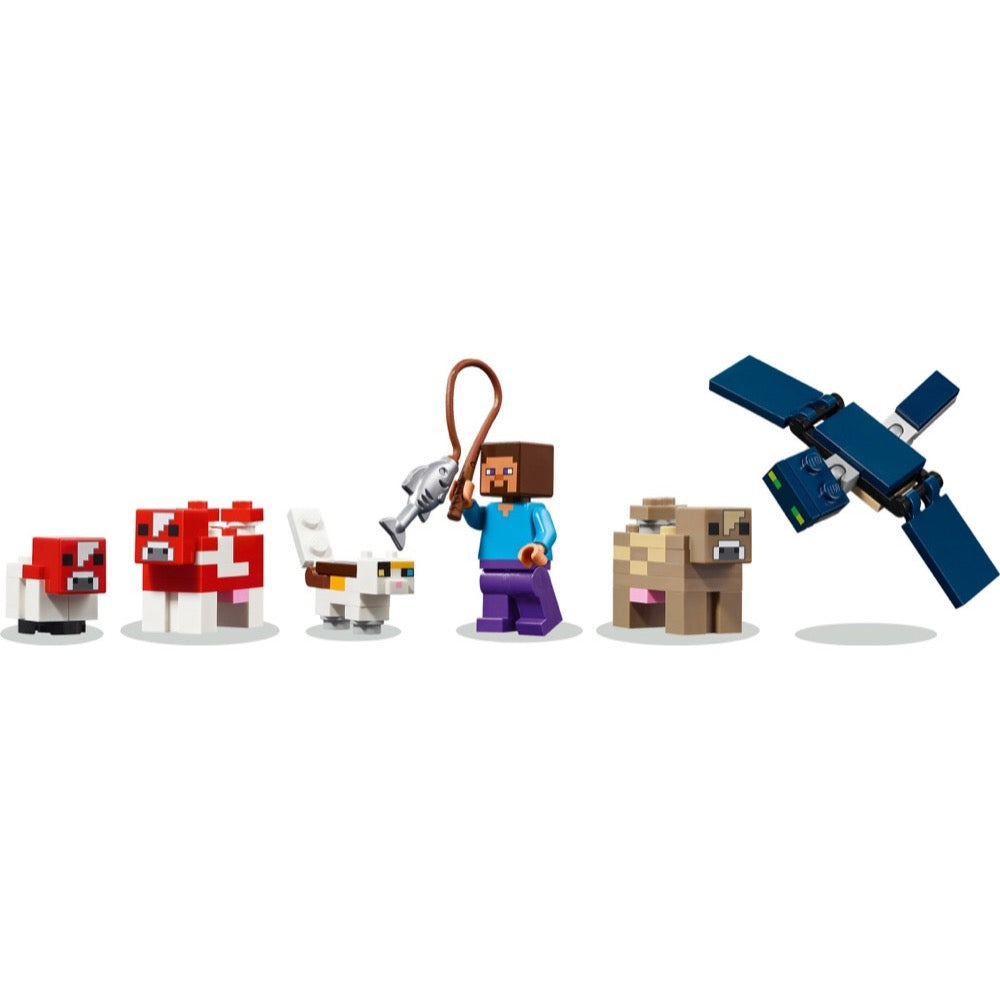 • Hands-on video game toy – Kids build a large, mooshroom-shaped house with a small farm on an island, go fishing in a boat and search for treasure