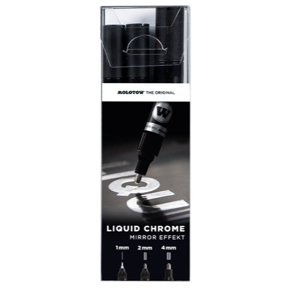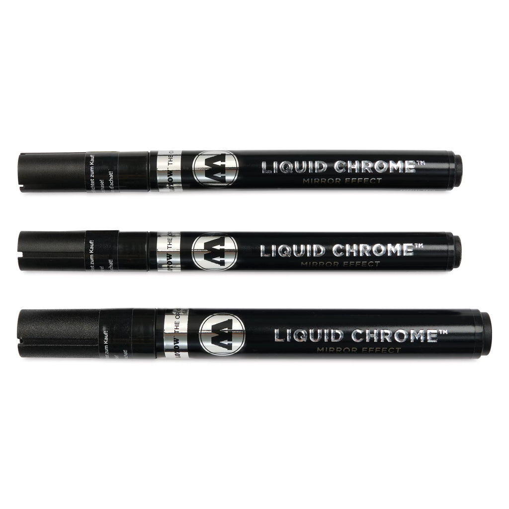 All good things come in threes. That‘s why our bestseller LIQUID CHROME is now available in a practical set of 3. LIQUID CHROME is known for its outstanding mirror effect, which is particularly visible on non-absorbent surfaces. Thanks to exchangeable tips and a practical refill in 30 ml, the pens can be used again and again.