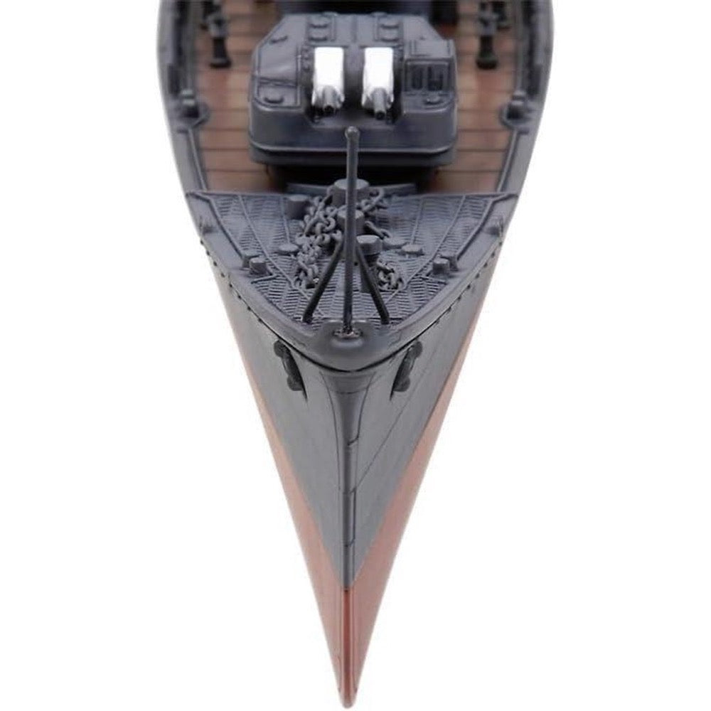 The full-hull model measures 338mm in length and 31mm in width, capturing the ship’s distinctive form and surface detail. Riveted side plates and degaussing cables are crisply reproduced on the hull halves, while metal anchor chain and metal propellers elevate realism straight from the box. Laser-processed machine gun parts provide a sharp, scale finish, and polycaps let the main turrets and torpedo tubes rotate freely for dynamic display. A display stand is included, and the completed model can be stored in the special commemorative packaging.