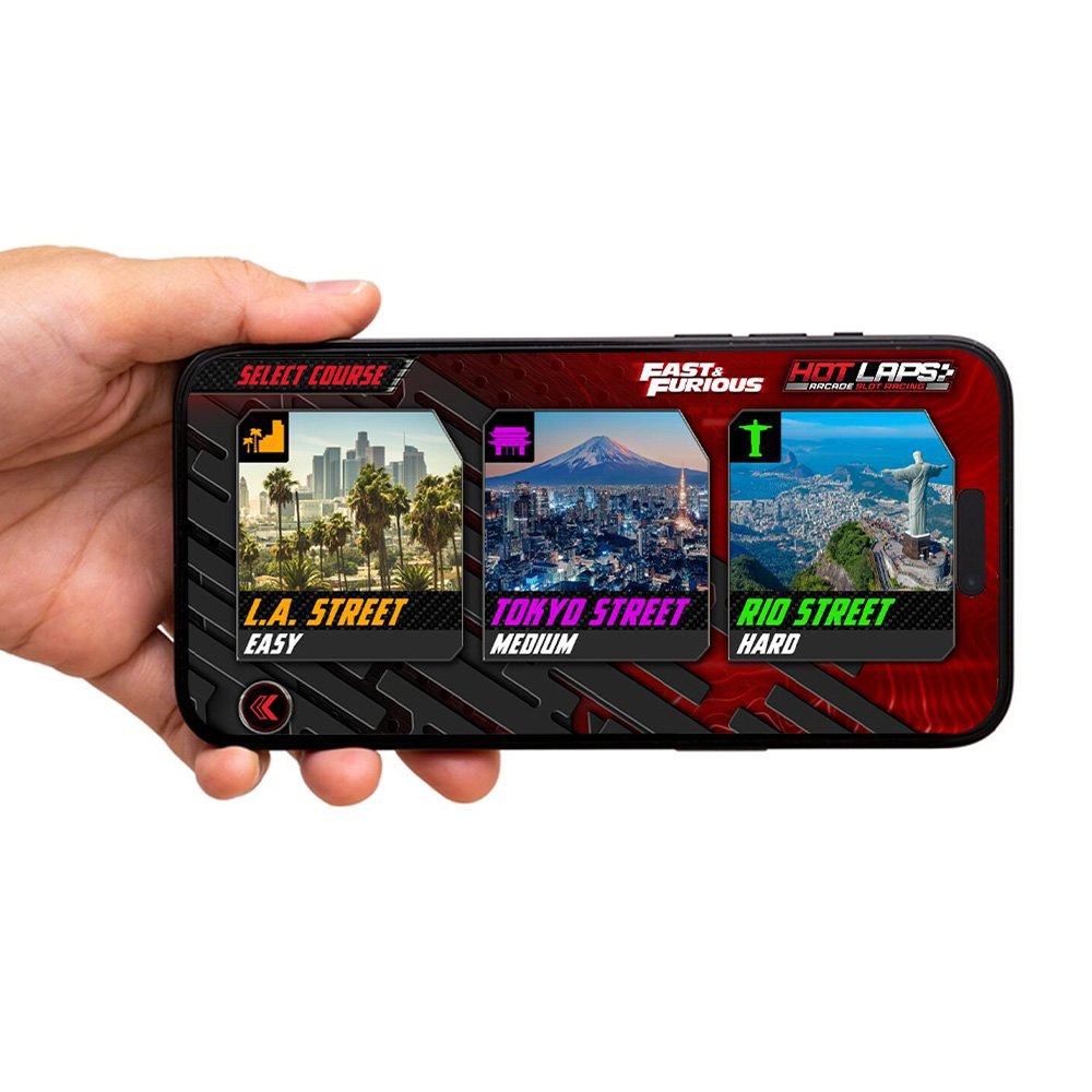 Enjoy arcade-style racing fun at home with the innovative Hot Laps app, which turns your smart device into a lap counter and race timerno extra hardware needed. Just place your phone or tablet on the included cardboard gantry and race!