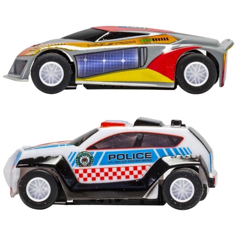 The chase is on with this Micro Scalextric Law Enforcer set! The police SUV is on the hunt for the futuristic fantasy style car – will they be able to catch up? These two exciting cars which have stronger magnets to help them stay on the track, but are designed to take a bashing for when they fly off!