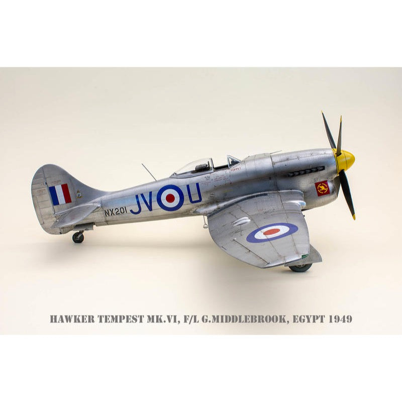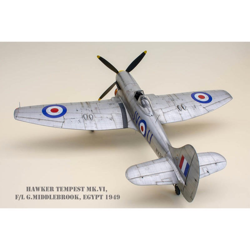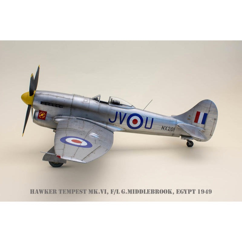 During World War Two the opposing sides were constantly competing against each other to keep abreast of the latest technological developments and as a result this led to ever more powerful and effective warplanes. In 1941 the new German Fw 190 fighter aircraft began to enter service and as its main response the British hastily developed the Spitfire Mk.V into the Mk.IX with a better Merlin engine, although they also introduced a new type called the Hawker Typhoon Mk.I into the service too. The Typhoon fighters were rushed into service and suffered from a number of teething problems and it soon became clear that the new fighter would not fit the requirements for a standard day fighter aircraft. Sir Sydney Camm who was Hawker‘s chief designer began to design a new fighter aircraft which was partially based on the Typhoon. At first this was known as the Typhoon Mk.II but soon was renamed as the Tempest and in the end, it became one of the very best WW2 fighter machines. Following the Mk.V and Mk.II versions, the Mk.VI was put into production. Though it happened yet during the war, the type saw front line service in the post war conflict areas, mainly in the Middle East as this version was equipped for harsh desert conditions. The Mk.VI was fitted with a more powerful version of the Sabre Mk.V engine and comparing with its predecessor, the Mk.V verison, it had also larger wing root radiator, oil cooler and engine intakes.