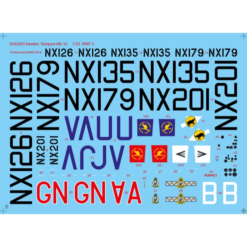The kit’s plastic parts come on eight runners of grey styrene and one with clear parts. All the major parts‘ surface is adorned with very fine rivet lines. Throughout the build, the modeller is quided via an A4 size full-colour instruction booklet. The colour schemes and decal sheets cater for four various Tempest Mk.VI machines, the first of which, ie Camo A option features an overall silver doped machine bearing the name Poppet, Camo B option brings a RAF day fighter scheme coloured machine with red and white fuselage code letters. One of the very few bare metal Tempests is portrayed in Camo C option and wears V fuselage code. The final option is a machine with RAF desert scheme. The decal sheets bring also a full set of airframe stencils including those for the interior and fuel tanks.