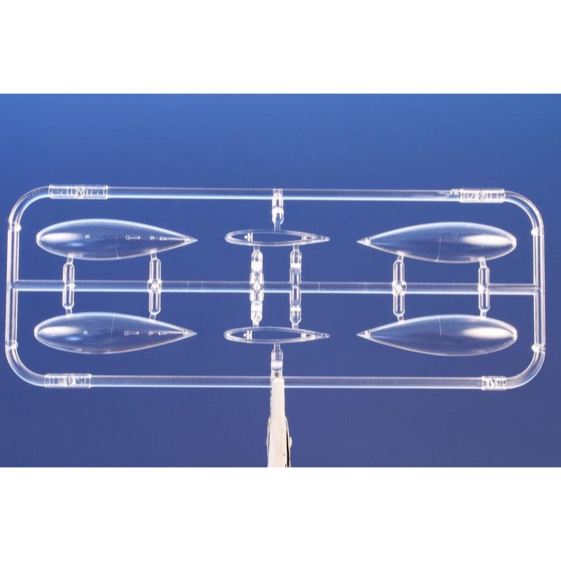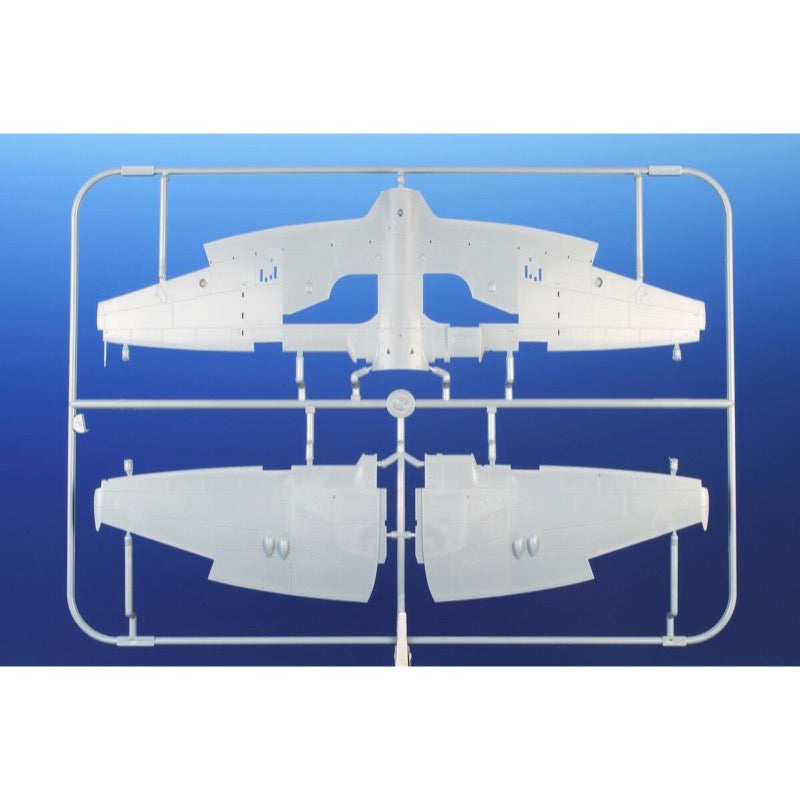 Our model of the Tempest Mk.II has been prepared in cooperation with Eduard. It contains eight styrene sprues including two clear parts sprues. The kit is topped up with a handful of resin items – resin undercarriage wheels, a partial replica of the engine with the covering panels, plus the necessary photo etches and painting masks. The decal sheet offers markings for five schemes – three as flown with the RAF, two of which are camouflaged and one in aluminium overall, then we have a Pakistani camouflaged machine and an Indian one in aluminium lacquer finish.